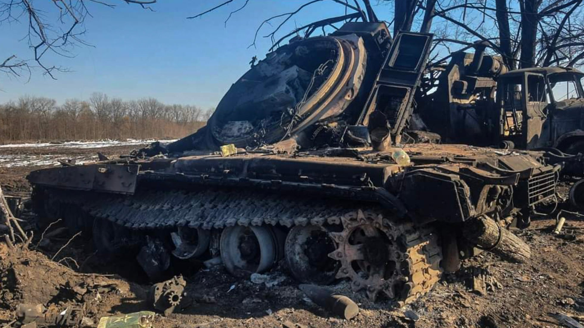 The T-80UM2 is said to have been part of a larger column of Russian vehicles that came under attack by the Ukrainian Armed Forces and photos show destroyed trucks alongside the T-80UM2. Its turret was knocked off and its hull burnt out, although it’s not immediately clear how it was hit and by what.