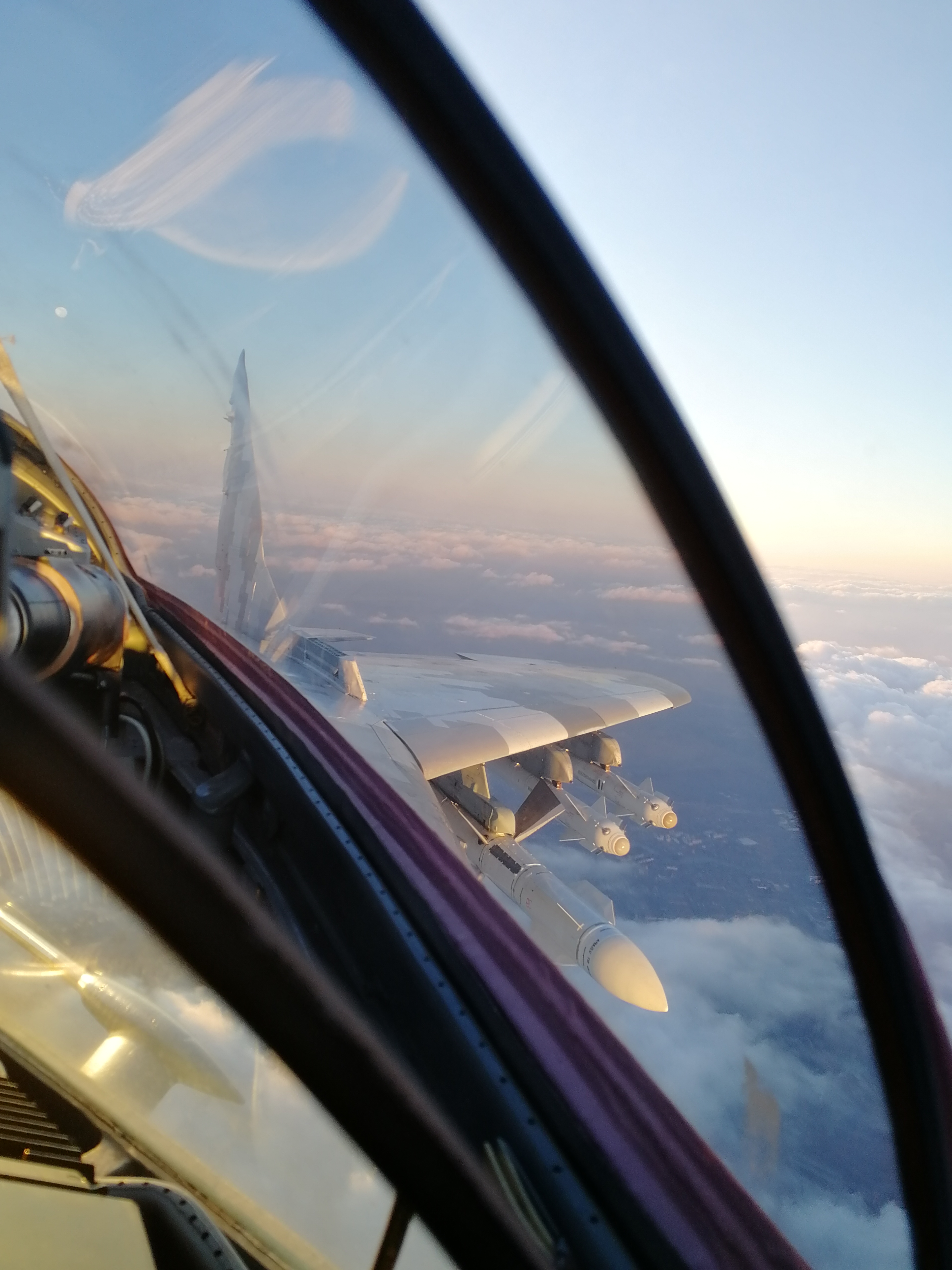 “I was patrolling not in my area and after that landed on another base. At night I was returning back to my base and still patrolling in my area. It was a pretty nervous mission because of bad weather and indications of aerial threats and ground threats. It was a large group, maybe 10 or more Su-35s. They were not very close to my area, but they were locking me even from this large distance and making some trouble with electronic countermeasures. I was trying just to not become a target for them and trying to be ready to maneuver and ready to get closer and to engage. There were also some guys up from a closer airfield, and they also helped us to push them away. Hopefully, it was pretty successful in their area too. Anyway, we are alive!”