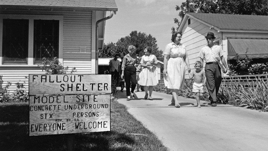 Families walk down the driveway while touring a model site home with a concrete basement fallout shelter, Texas, 1961. (Photo by Shel Hershorn/Getty Images)