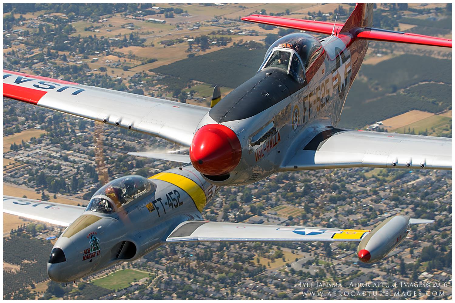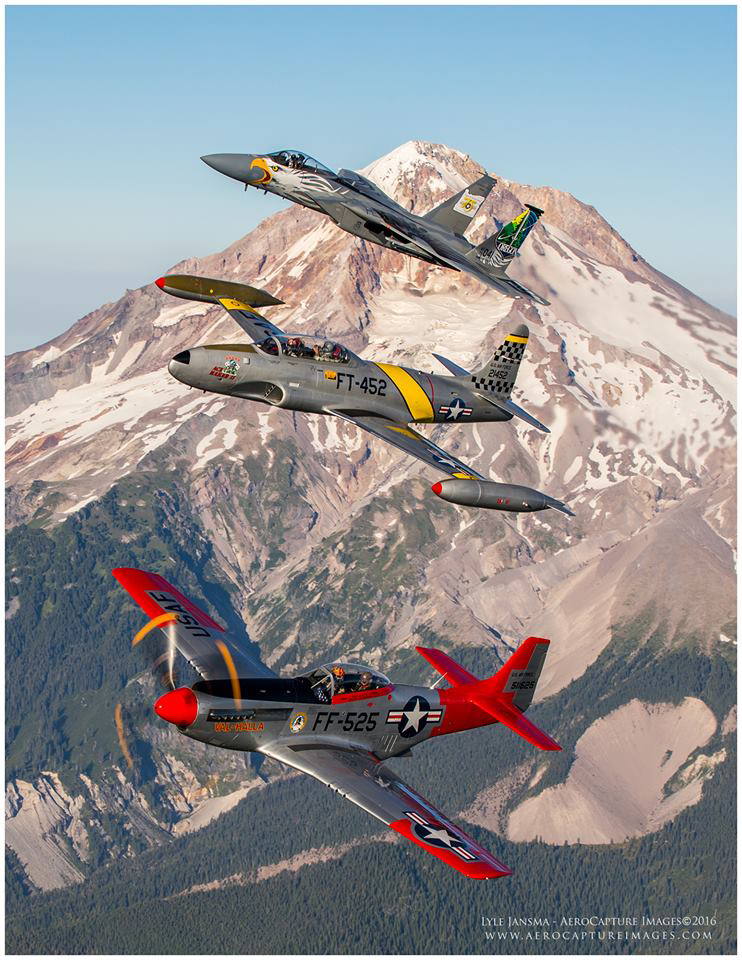 Our good friend and warbird photographer extraordinaire, Lyle Jansma, took to the air with the Oregon Air National Guard’s gorgeous “screaming Eagle” 75th anniversary F-15C, as well as the P-51 Mustang “Val-Halla” and the T-33 Shooting Star “Ace Maker II” for what has to be one of the coolest heritage photo flights of all time.