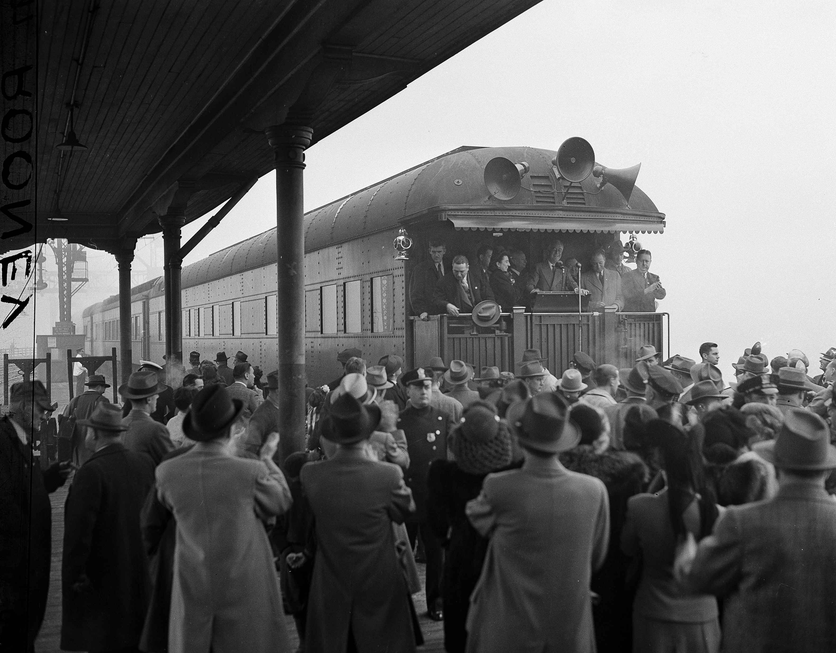 Many famous people rode in the President’s car, including Winston Churchill, and key war planning was done in its conference room. FDR used the car extensively for his 1944 campaign, setting up shop right on the car’s elevated rear platform. Loudspeakers were installed on its roofline for this purpose, a signature feature on previous campaign cars used by Roosevelt. The train allowed FDR, who suffered from polio, to make public appearances under controlled circumstances, as health concerns had loomed heavily over his candidacy. A special wheelchair was also constructed for FDR to use while on the U.S. Car No.1.