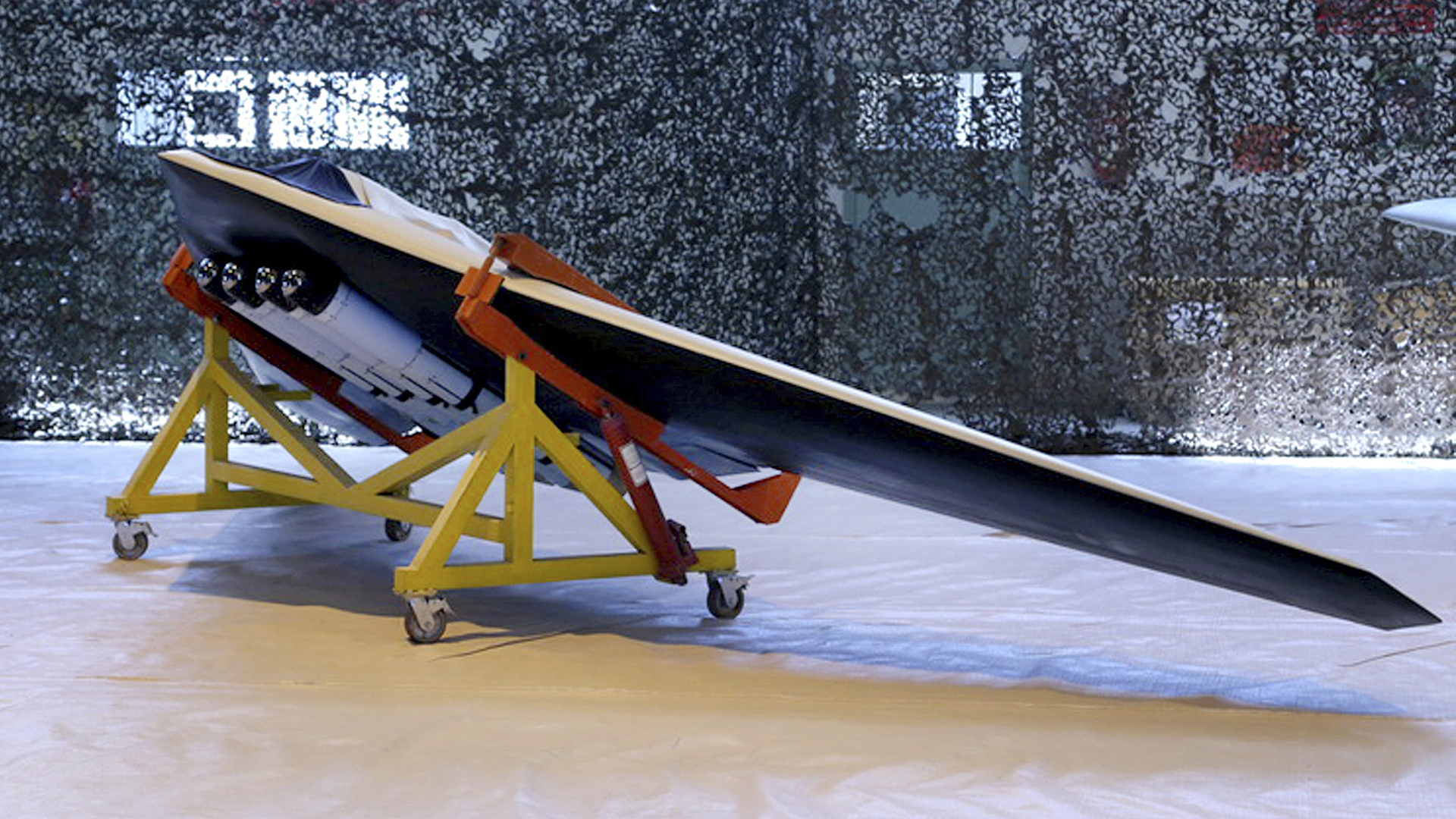 We also see what looks like the underbelly of one of these aircraft loaded with air-to-ground missiles. Obviously this configuration largely negates the advantages of a stealthy flying wing design, and what would provide targeting for those missiles remains unclear. Their method of mounting also looks suspect. In fact, the whole setup looks hastily mocked up, and not representative of a real capability. Additionally, none of these supposed new unmanned combat air vehicles (UCAVs) are seen sitting on their own undercarriage. They probably lack this feature entirely; instead, these much lighter and smaller airframes are likely sling-launched, or use a booster to go airborne.