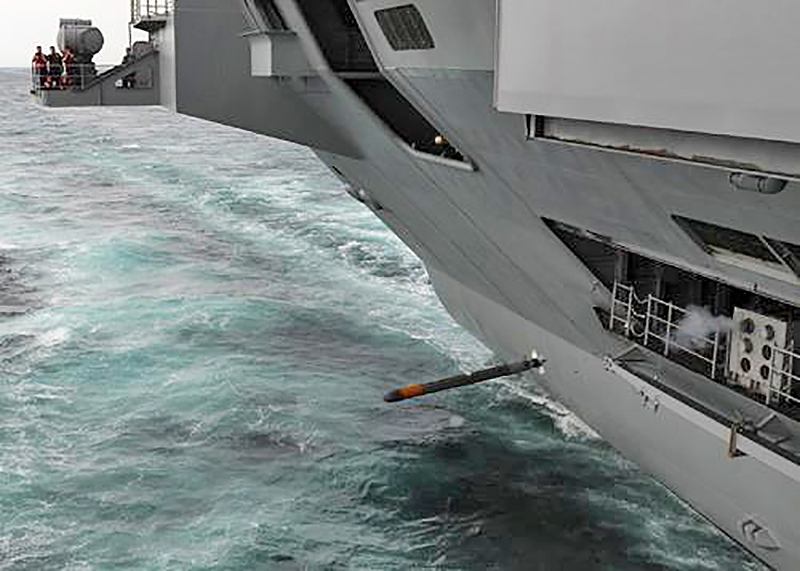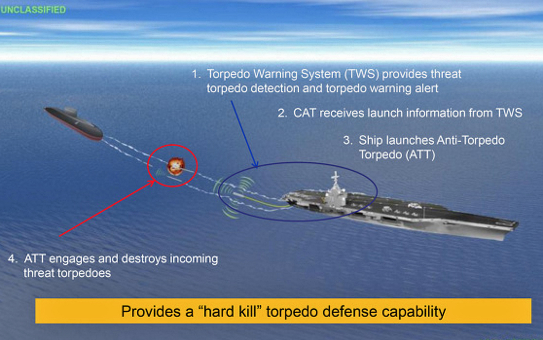 SSTD, which was developed fairly rapidly over the last decade, is a combination of systems that work together to defend the carrier (and eventually other smaller surface combatants) against torpedo attacks. It includes three major components. The first is a towed array acoustic sensor system called the Torpedo Warning System (TWS) that does just as it says, it detects an incoming torpedo. This sensor is trailed off a carrier’s fantail, so it’s particularly well suited for detecting incoming wake-homing torpedoes. This towed array is tied to tactical control stations that provide early warning, threat classification amd course of action advice to the ship’s Combat Information Center and bridge. The third and final component of SSTD is the Countermeasure Anti-Torpedo (CAT).