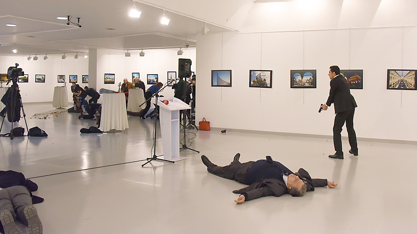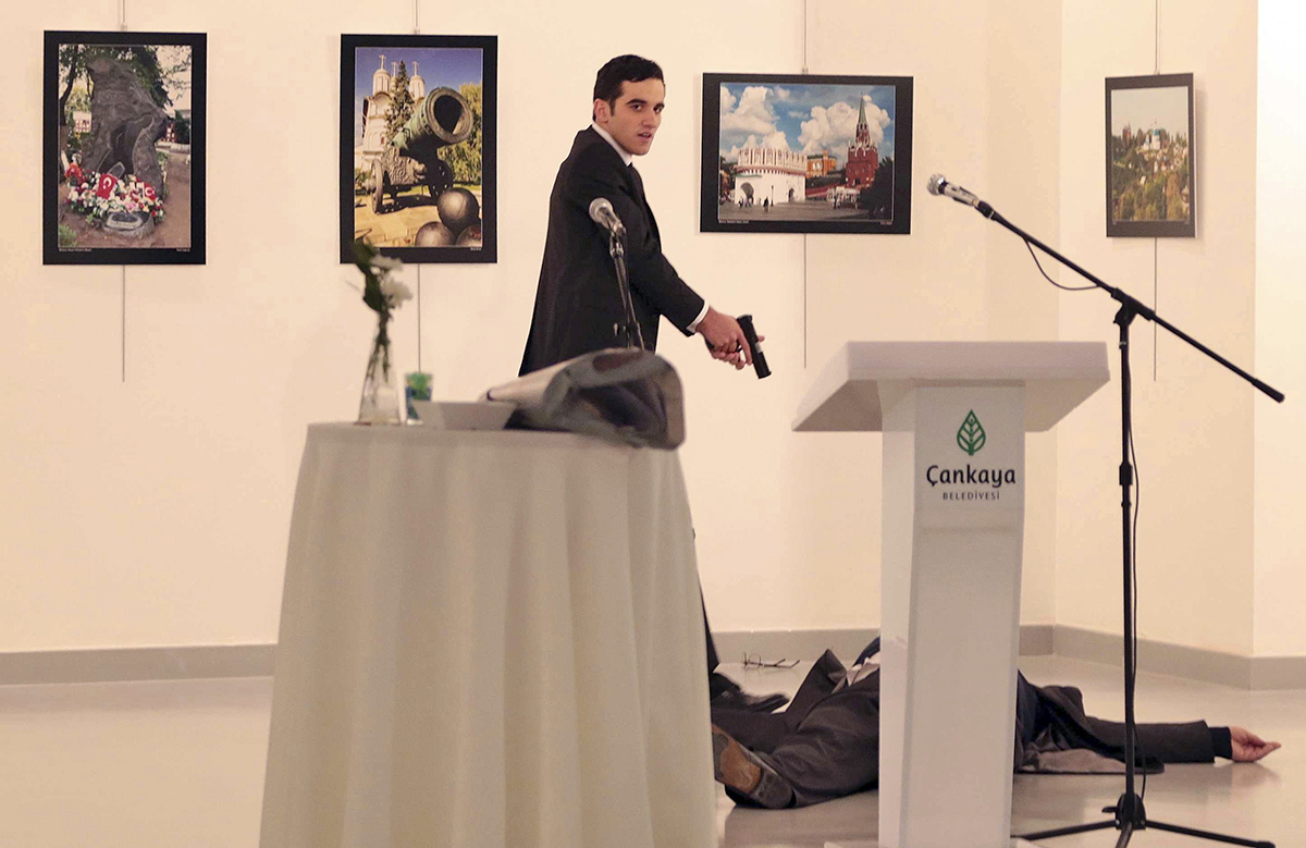 The horrific moment occurred while the ambassador was speaking at an art gallery in the Turkish capital of Ankara. A ranting man in a suit pulled a pistol and shot the Ambassador from behind. Security forces quickly counter-attacked and killed the assailant, but he made his message clear before being taken down in a barrage of gunfire.