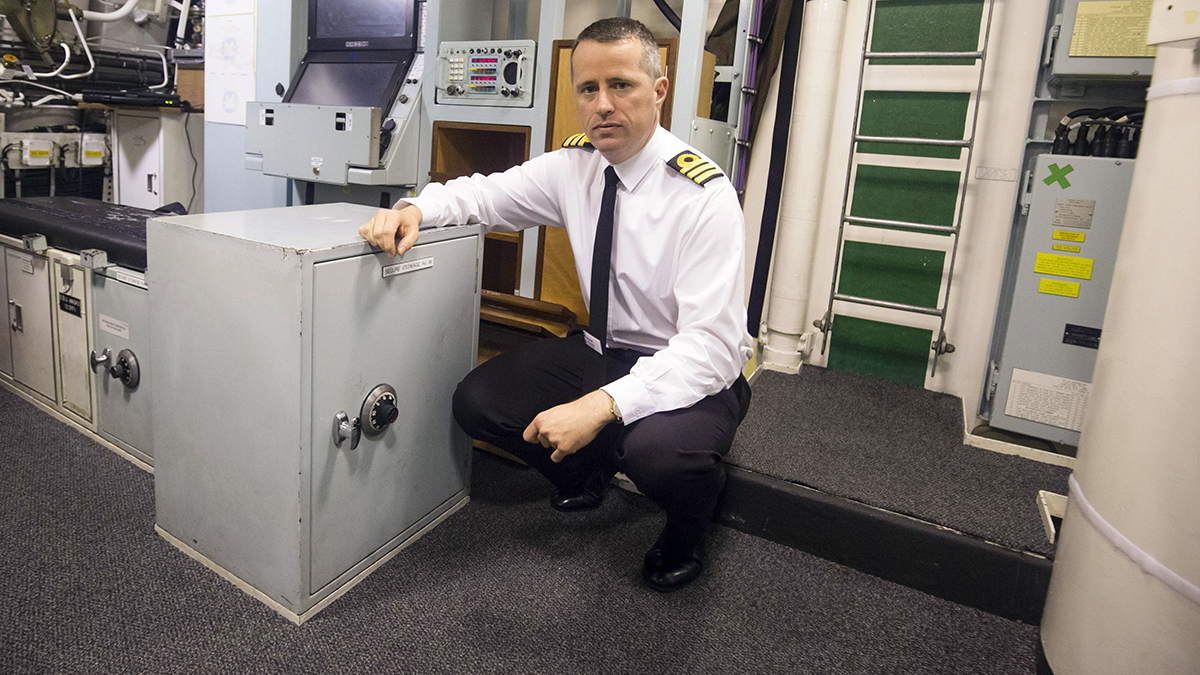 Daniel Martyn Commanding Officer of HMS Vigilant next to a safe that contains the Prime Minister’s last resort instructions, on board Vanguard class submarine HMS Vigilant (AP photo):