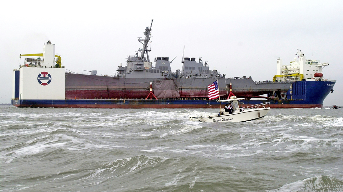 USS Cole being transported by the M/V Blue Marlin following the suicide bomber blast the killed 17 sailors and wounded scores more on October 17th, 2000: