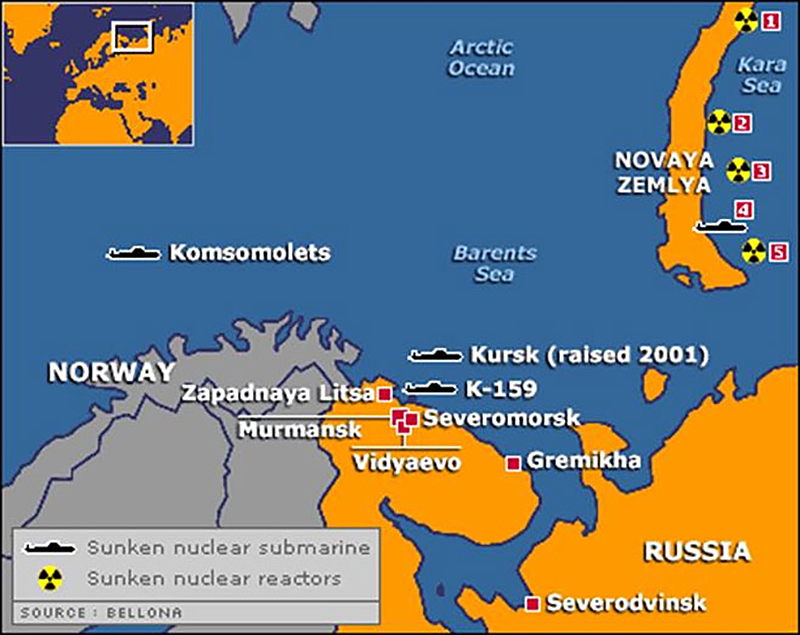 A graphic showing the known nuclear waste and wreckage sites near northern Europe and the Arctic (Bellona.org graphic):