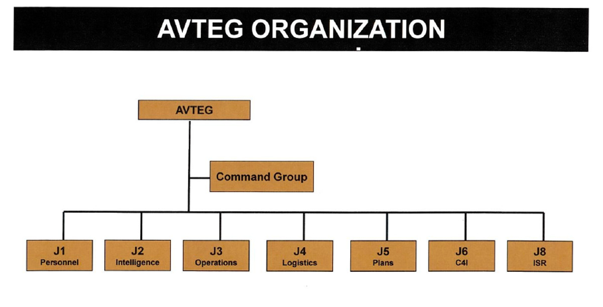 The breakdown is almost completely standard. A unit made up of individuals from across the services, AVTEG has a command group and seven “joint” offices, including typical administrative, operational and supporting elements.