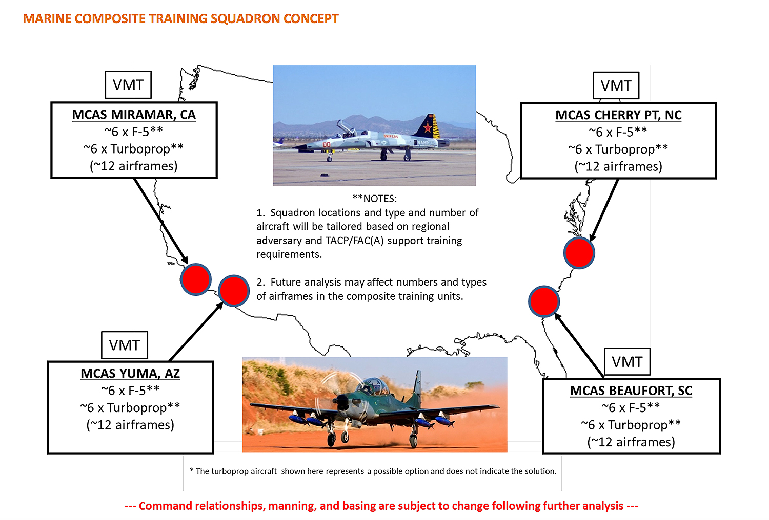 “Further desired expansion of the F-5 program, to potentially include a permanent footprint at MCAS Beaufort in FY18, and conceptual plans for adversary elements at MCASs Miramar, Yuma, and Cherry Point are being explored. Efficiently colocating adversary support with the operational forces generates the most readiness for our operational forces at the least cost. Composite training squadrons beneath 4th MAW will also leverage on extensive TACAIR experience and contribute to enhanced Reserve integration across aviation… Procurement of numerous F-5s with significant service life remaining would allow the USMC to meet, with organic assets, most requirements for adversary training. The first phase of expanded adversary capacity will be to establish a detachment on the East Coast in support of VMFAT-501 at MCAS Beaufort, S.C. for F-35 pilot production requirements.”