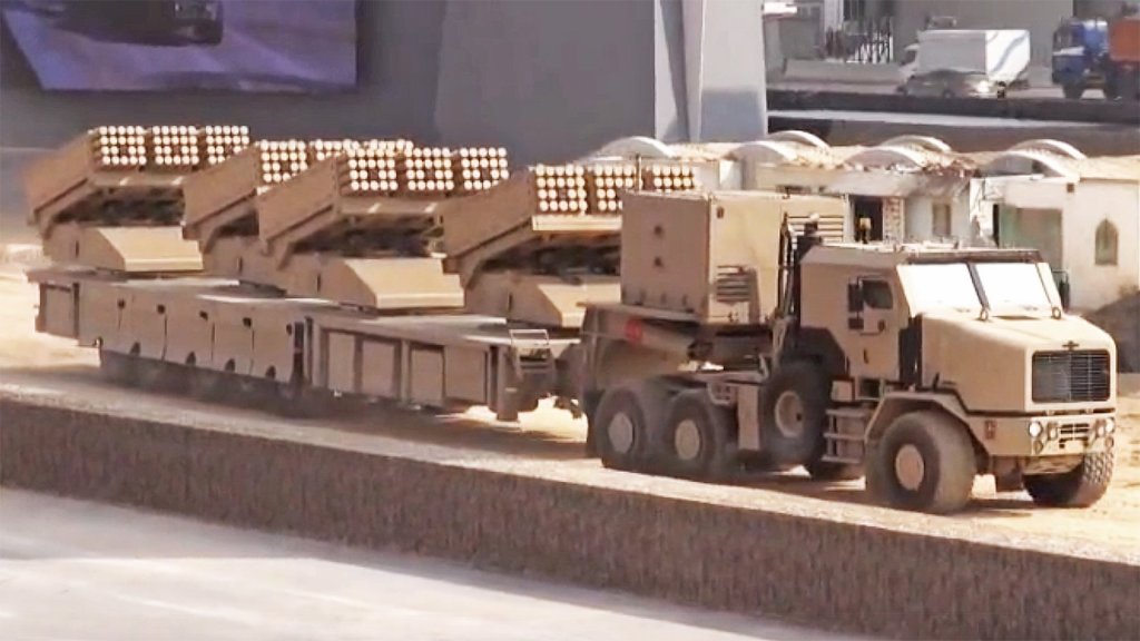 Jobaria is in the process of making a longer-range, harder-hitting companion to the MCL, dubbed the Twin Cradle Launcher (TCL). The concept was shown off at this year’s IDEX weapons expo in Dubai. Instead of four launchers for hundreds of smaller artillery rockets, two sets of four massive 300mm rocket launch canisters are incorporated into the system’s trailer which is about eight meters shorter than the one used by the MCL.