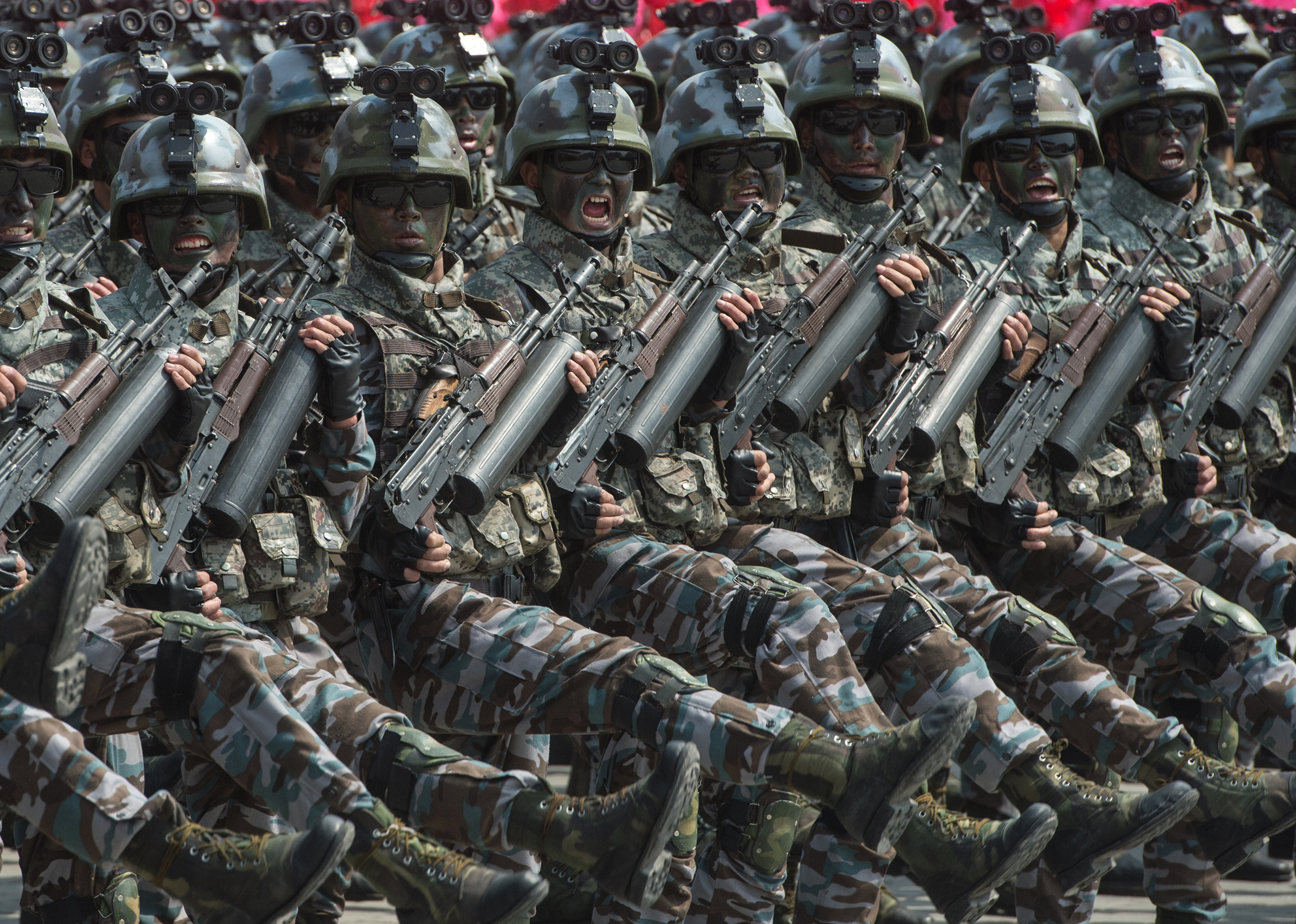 North Korea’s special operations forces looked pretty spooky during their march. They were wearing some pretty cool camo, sporting night vision goggles, and toting Type 88s (local AK-74 derivative) with top-folding stocks and helical high-capacity magazines which store at least 100 rounds.