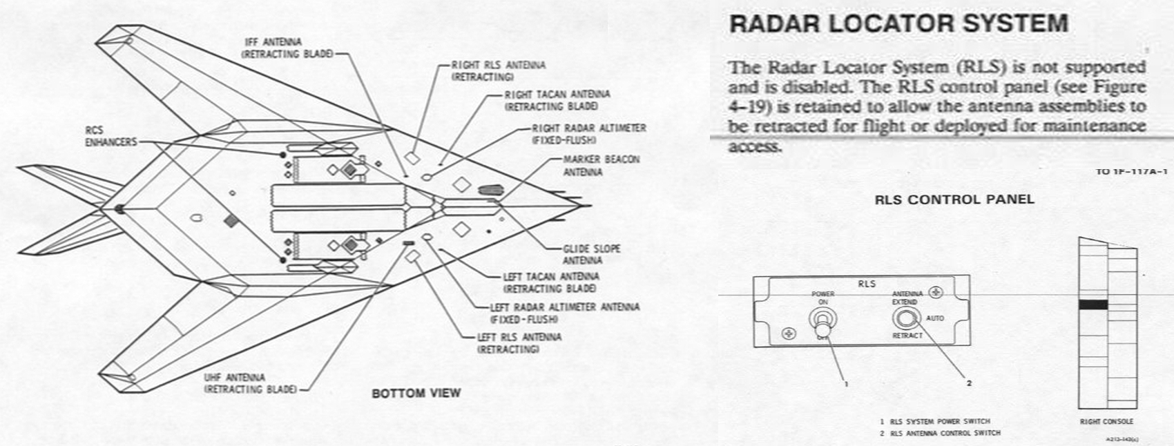 Not just that, but the RLS is prominently featured in the F-117’s “Dash One” operating manual. It is not only mentioned, and its abandoned control panel identified, but its location is also shown clearly in a diagram of the jet. You can see the mentions below, and the entire manual is available online here.