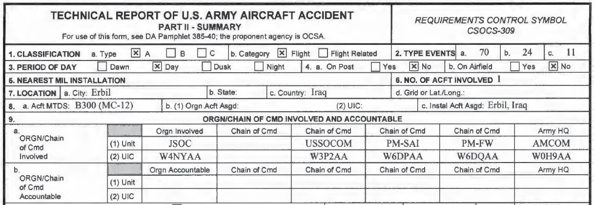 The formal chain of custody starts with U.S. Army Aviation and Missile Command (AMCOM), the service’s top manager for aircraft of all types. Then it moves down through Program Manager-Fixed Wing (PM-FW) and Program Manager-Sensors-Aerial Intelligence (PM-SAI) and finally to U.S. Special Operations Command (SOCOM). At the very end, JSOC is listed as the “organization involved” at the time of the incident.
