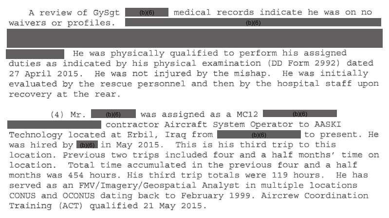 Thanks to FOIA, the War Zone has obtained a more in depth view of these operations from the U.S. Army’s official report on the crash of a mysterious spy plane with the civilian registration code – N6351V – and paint job to match crashed into a field outside the town of Kawrgosk in northern Iraq on March 5, 2016. Though accident report is both heavily redacted and significantly abridged to begin with for operational security reasons, the formal review confirmed the aircraft was supporting JSOC’s forces.