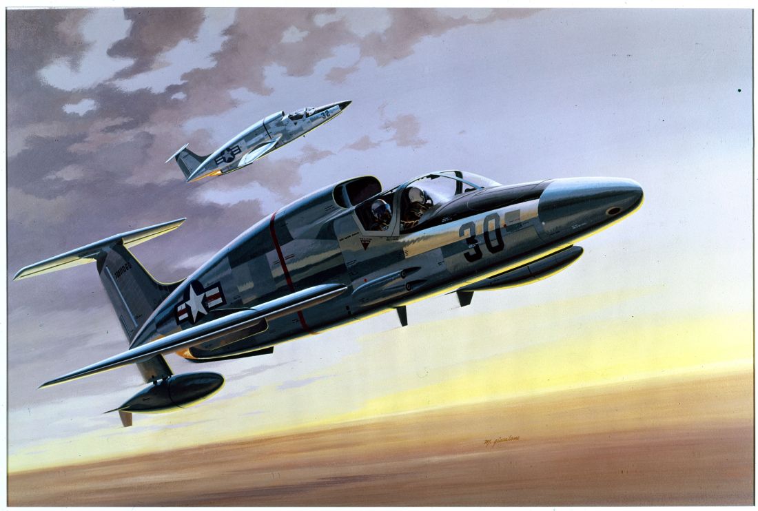 Not surprisingly, Ryan’s art showcases these prototypes, with twin jet engines and lift fans in the wings and nose, which the company had crafted for the Army. Offering the ability to operate like a helicopter, but with the cruising speed of a fixed wing jet, the service wanted to explore their potential in both the close air support and rescue roles.