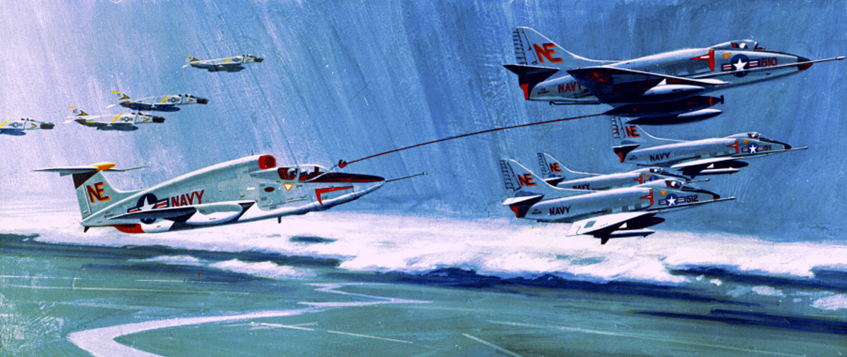 Another image shows an elongated Vertifan design in a Navy paint scheme flying along with A-4 Skyhawk attack aircraft and F-4 Phantom fighter jets. One of the A-4s is refueling the Vertifan in mid-air using a “buddy pod” system. It’s not entirely clear whether the proposed variant was a fighter, attack aircraft, spy plane, or electronic warfare platform – akin to the EA-3B and EKA-3B Skywarriors – since it carries no obvious weapons, but has pods or slipper tanks on its wings. There was also a larger anti-submarine warfare concept, which Ryan would likely have pitched to the Navy, too.