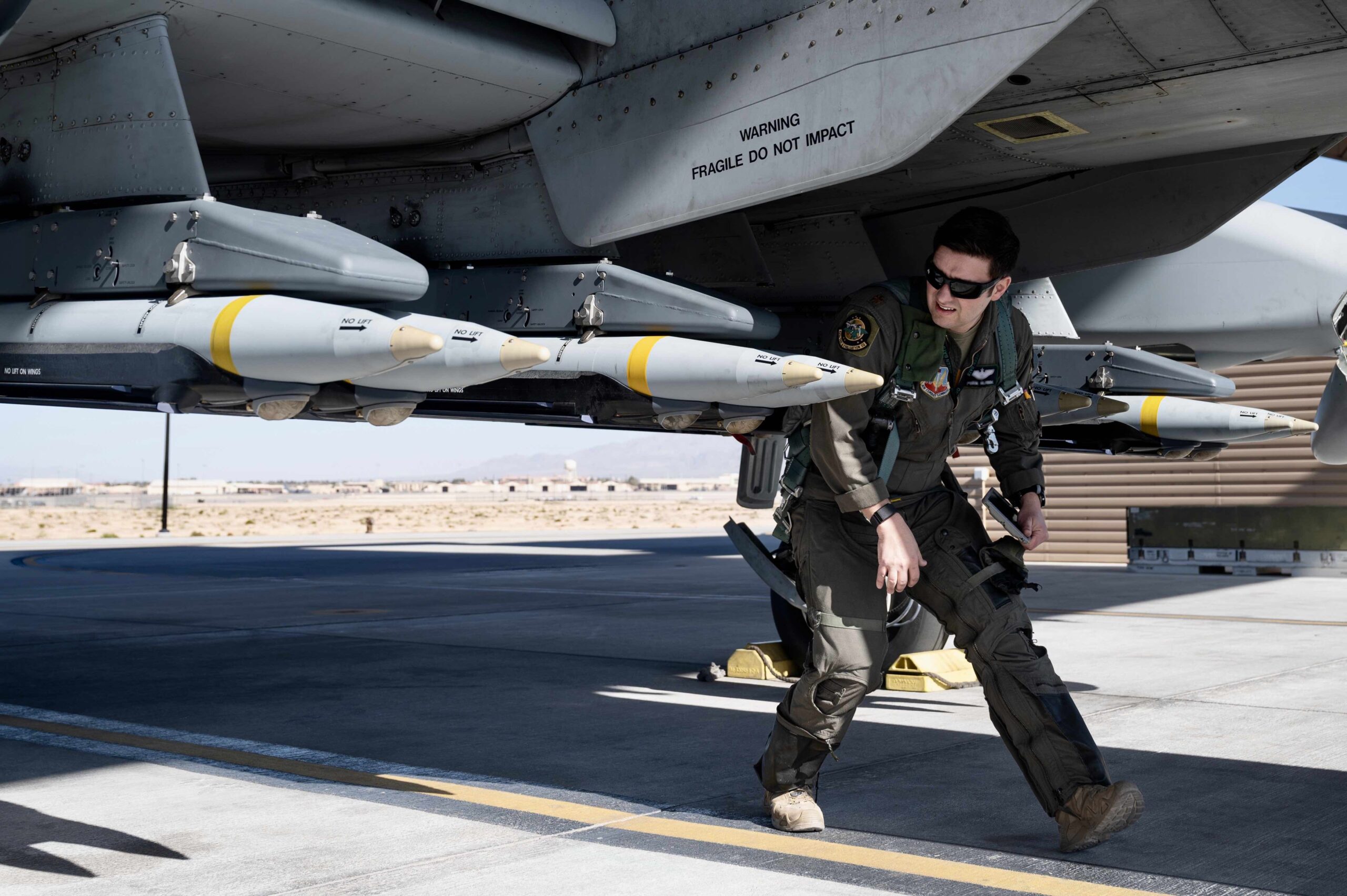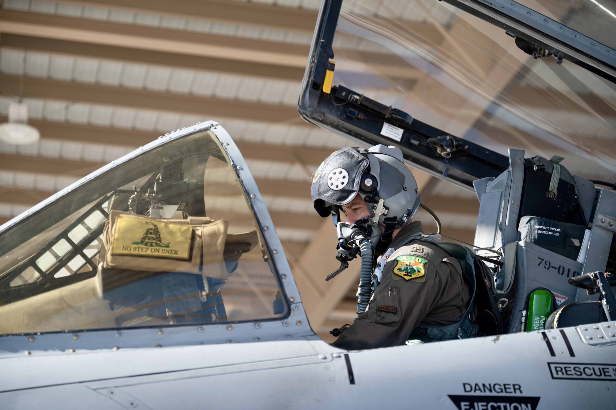 In the images below, we see a pilot assigned to the 422nd TES inspecting the additional SDB racks under an A-10. After performing the necessary inspections and putting on his helmet and oxygen mask, the pilot taxis out of the aircraft hanger before taking flight.