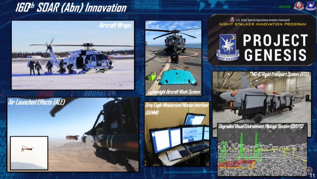 The full slide from Waleski’s briefing, seen below, does make clear that the 160th’s recent camouflage work is an outgrowth of Project Genesis, an internal innovation “challenge” within the Army special operations aviation community that kicked off in 2022. The same slide also highlights the Degraded Visual Environment Pilotage System (DVEPS), which helps pilots navigate safely through dust and other obscurants, and shows a Night Stalker Black Hawk launching an ALTIUS 600 drone in mid-air. These are capabilities the Army has been working to field in conventional units, as well.