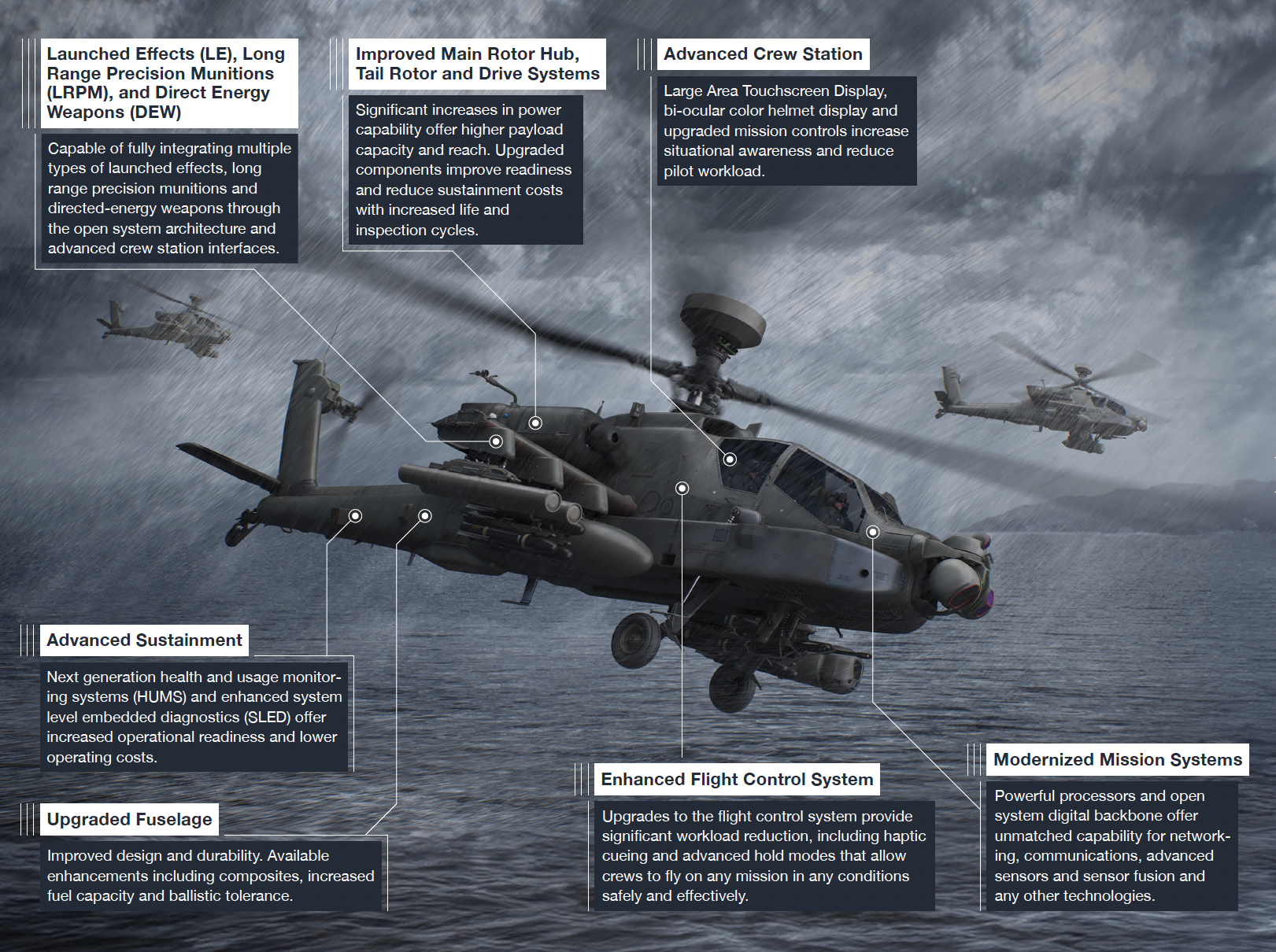While an AESA radar was not specifically mentioned, there is an ambition to move the AH-64’s current Longbow fire-control radar from its mast-mounted position and integrate it into the fuselage, to bring aerodynamic improvements.