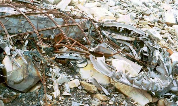 During a 2003 visit, an investigation team found the aft crew compartment, the rear bomb bay, and one section of the outer wing, as the only significant intact parts, with the wreckage otherwise mostly consisting of the tiny pieces left after the demolition team did their work.