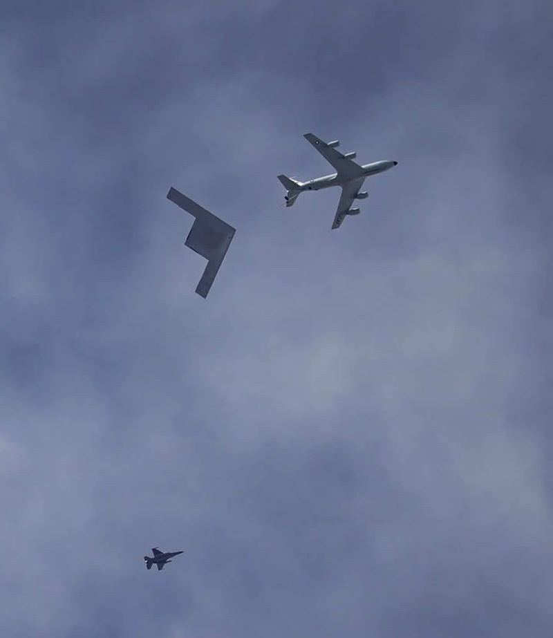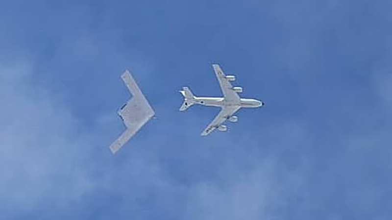 Another image shows the B-21 being chased by an F-16, which is customary for test flights.