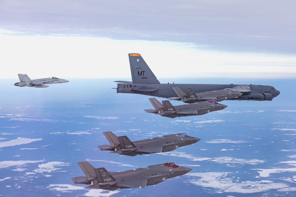 While over Tallinn, the strategic bomber joined a formation with four F-35A stealth fighters and a pair of F/A-18 Hornets. The F-35s were very likely Royal Netherlands Air Force examples that are currently conducting the Baltic Air Policing mission out of Ämari Air Base in Estonia. Meanwhile, the F/A-18s were from the Finnish Air Force.