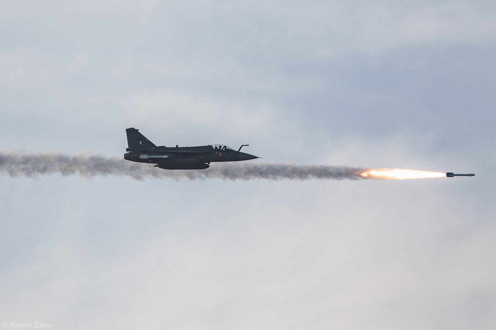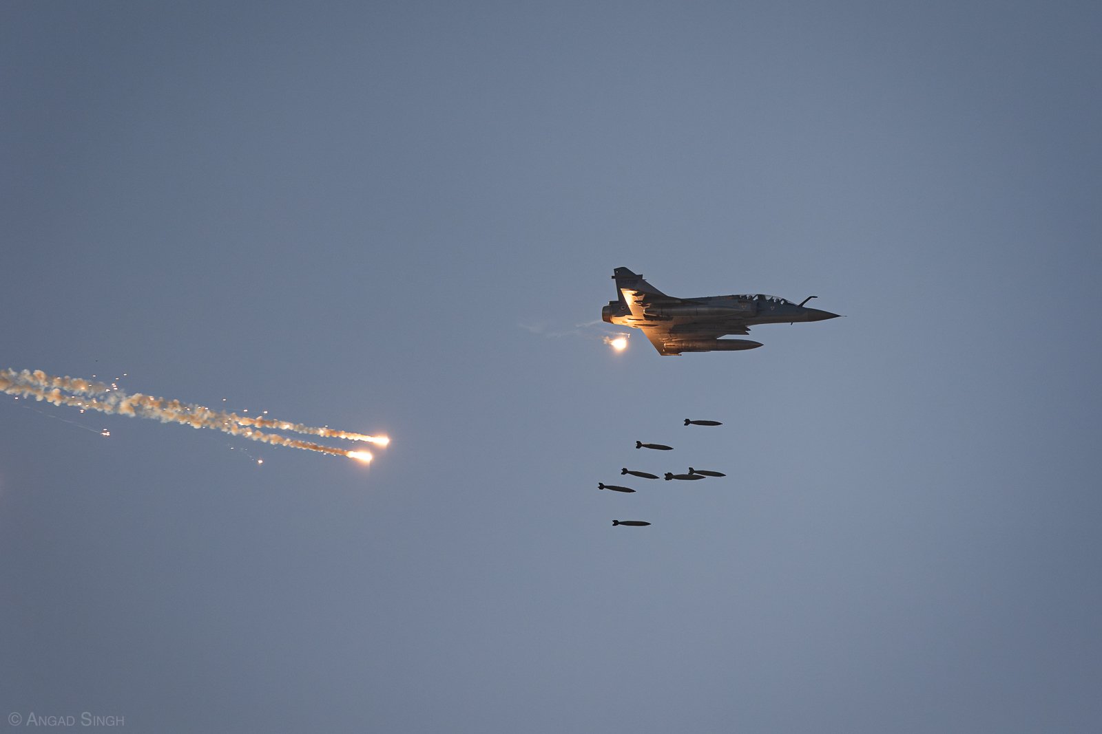 The action then switched briefly away from ground attack as a Rafale DH maneuvered in front of the grandstand and launched an MBDA MICA IR heat-seeking missile at an expendable drone target. This was followed by a lone HAL Tejas dropping a single 1,000-pound laser-guided bomb on a simulated enemy command center, with a Su-30MKI delivering the knock-out blow of five 1,000-pound unguided bombs on the same target.