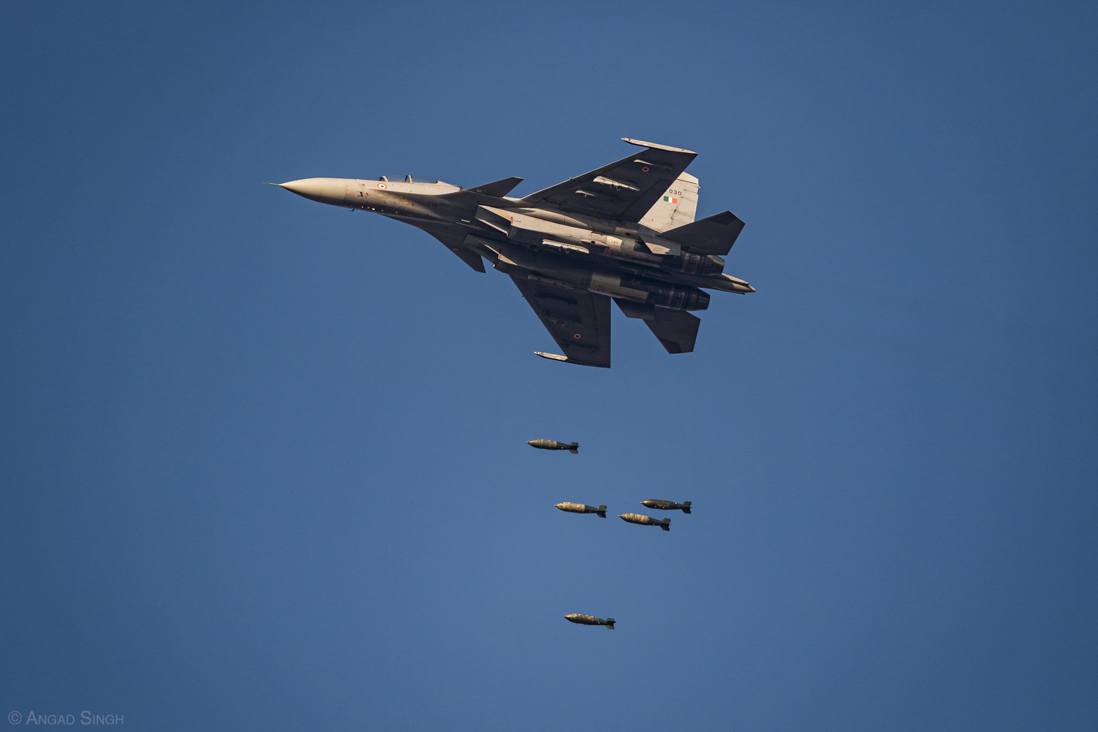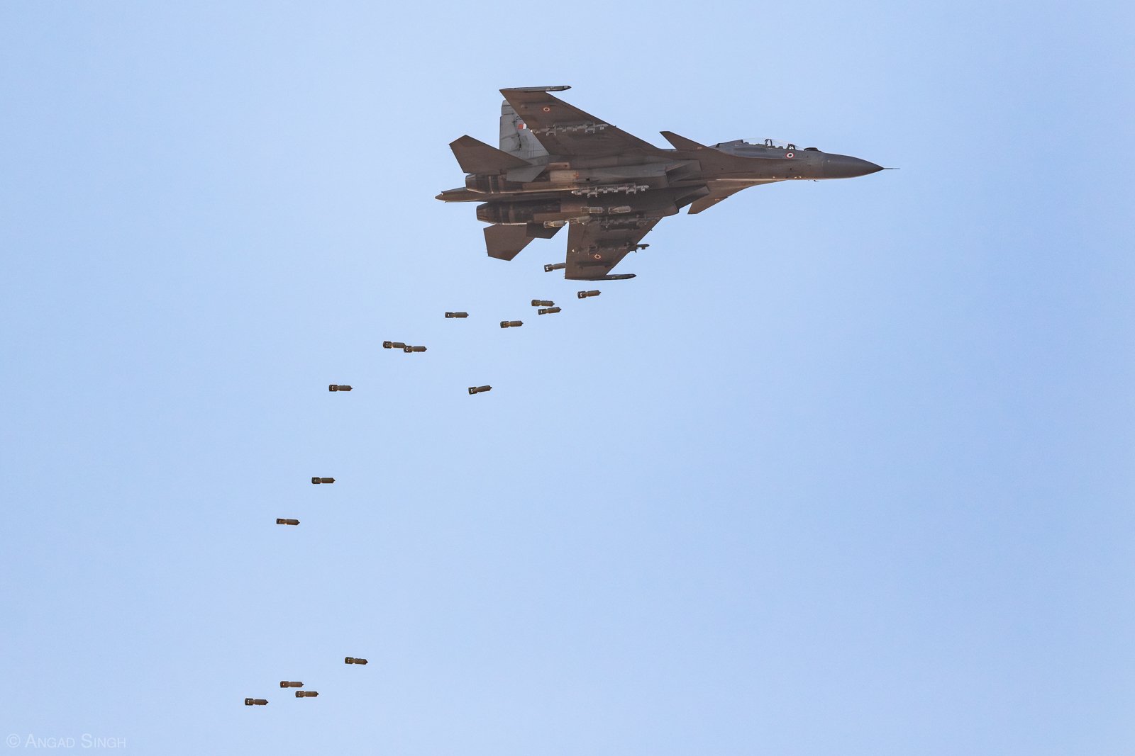 A pair of upgraded DARIN II Jaguar ground-attack jets then ran in from directly ahead, capturing high-resolution imagery with their Israeli-produced RecceLite reconnaissance pods. Next, the ‘firepower’ portion began in earnest, with a pair of DARIN I Jaguars racing in from the east to deliver six 1,000-pound retarded bombs at the low levels the type is famous for. These were followed by two upgraded Mirage 2000s dropping eight 250-kilogram bombs each. Flying in from the right shortly after came a pair of Su-30MKIs, dropping 10 1,000-pound freefall bombs in total on a mock bridge target.
