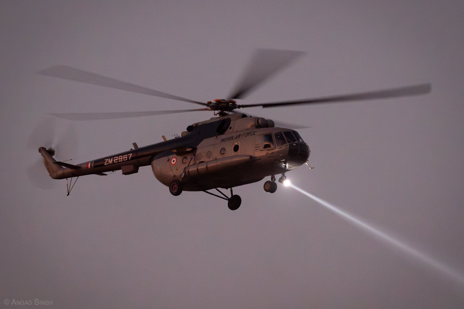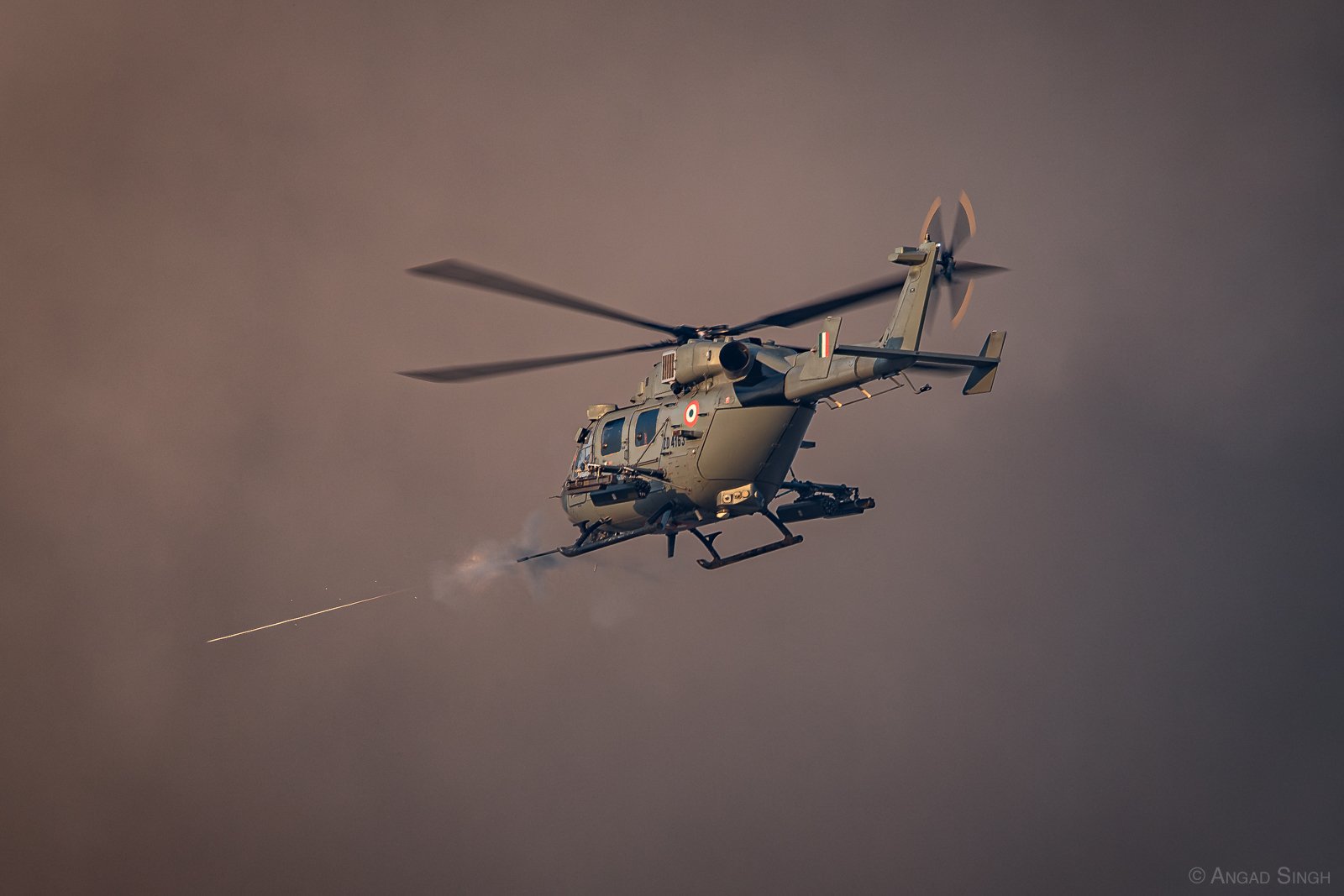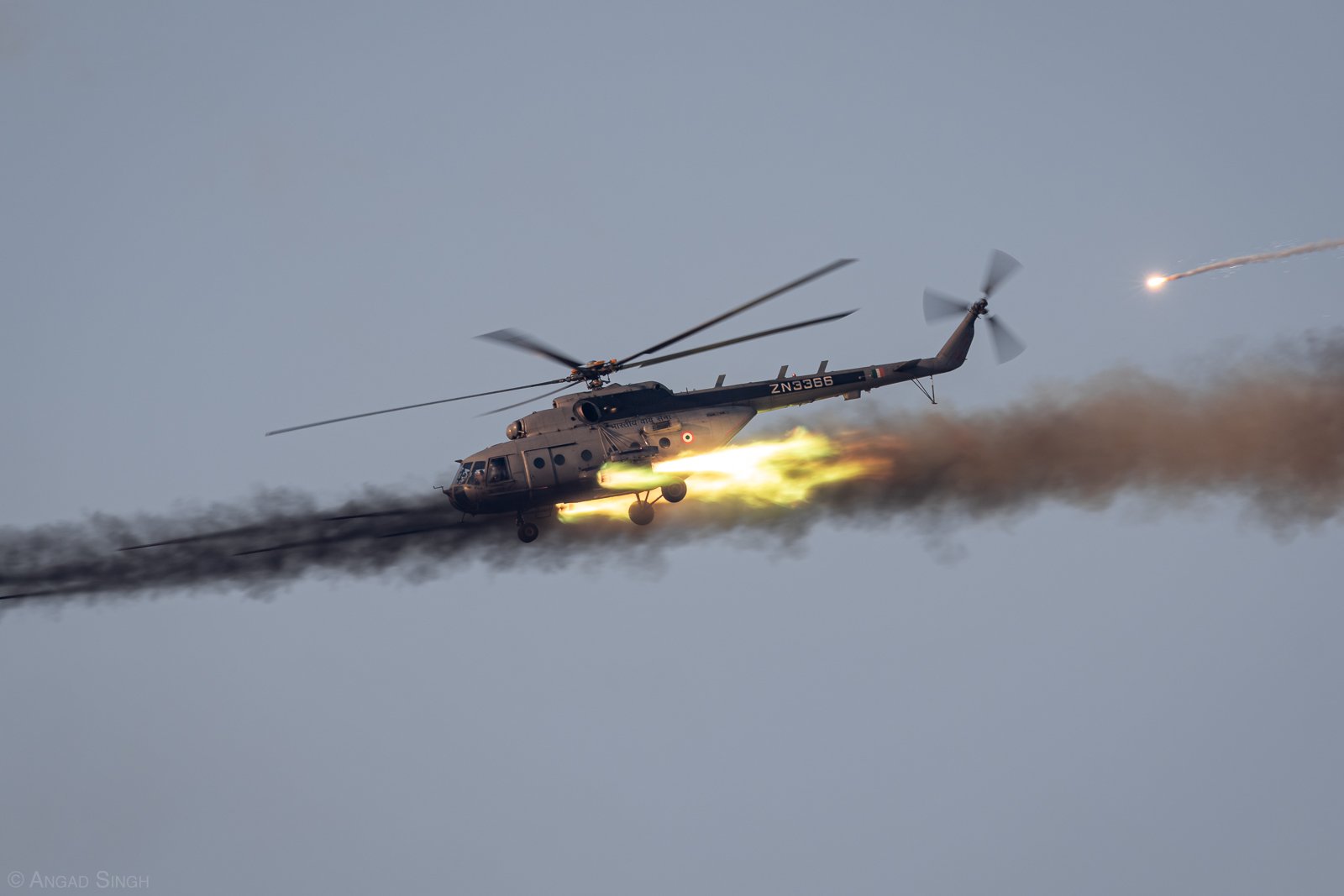 The Indian Army then made its Vayu Shakti debut with a pair of Rudra combat helicopters in a menacing all-black scheme rocketing a simulated tank convoy with 70mm projectiles. These were trailed by two IAF Mi-17-1Vs that fired 80mm S-8 rockets on a fuel dump target.
