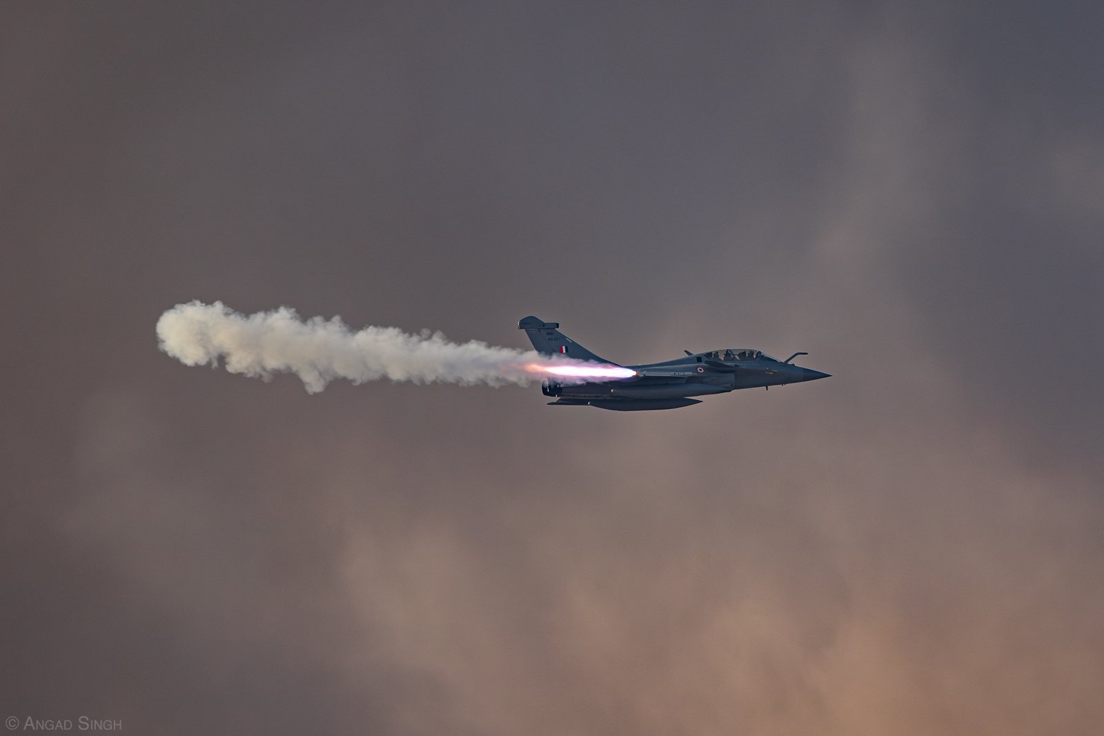 The two-hour day/night event was kicked off by a trio of HAL Chetak (locally produced Alouette III) helicopters each trooping the IAF Ensign. Moments later, a Rafale — the Indian Air Force’s newest fighter making its Vayu Shakti debut — shattered the evening calm with a low-level supersonic pass in front of the grandstand, its sonic boom heralding the action that was to follow.