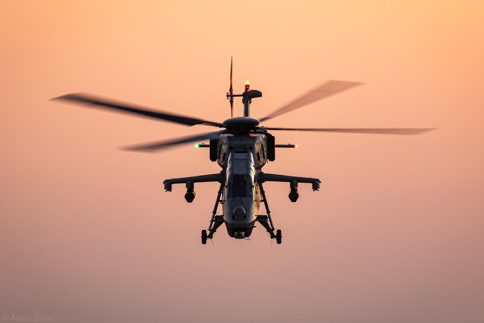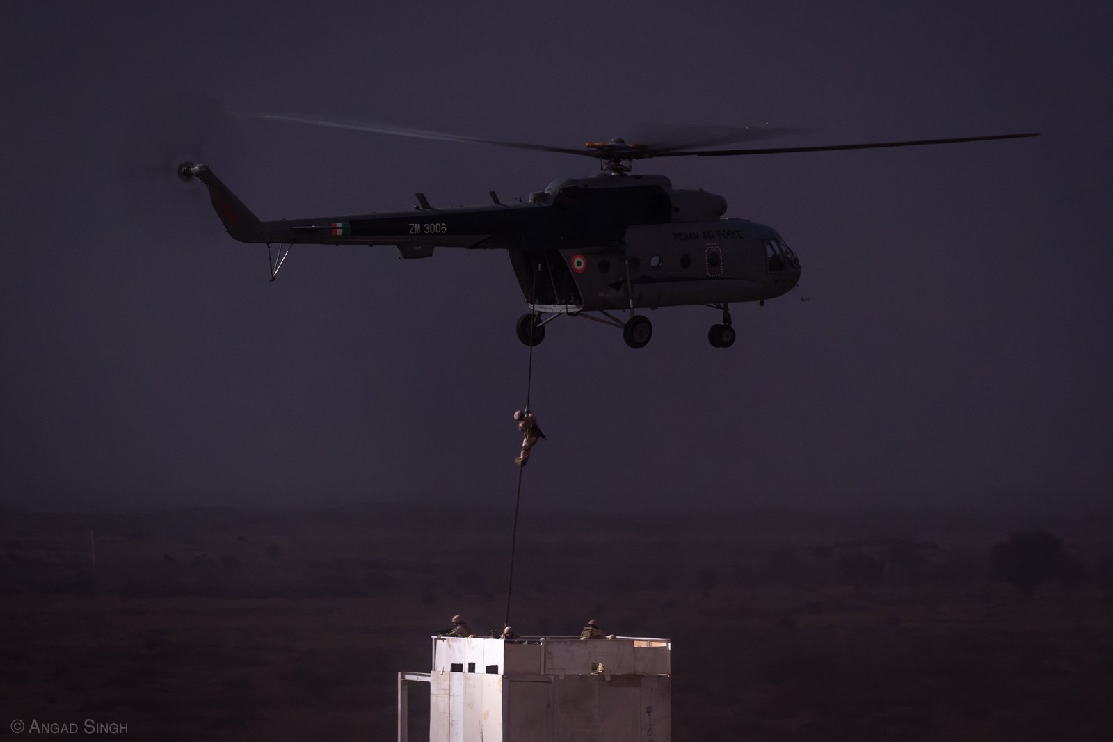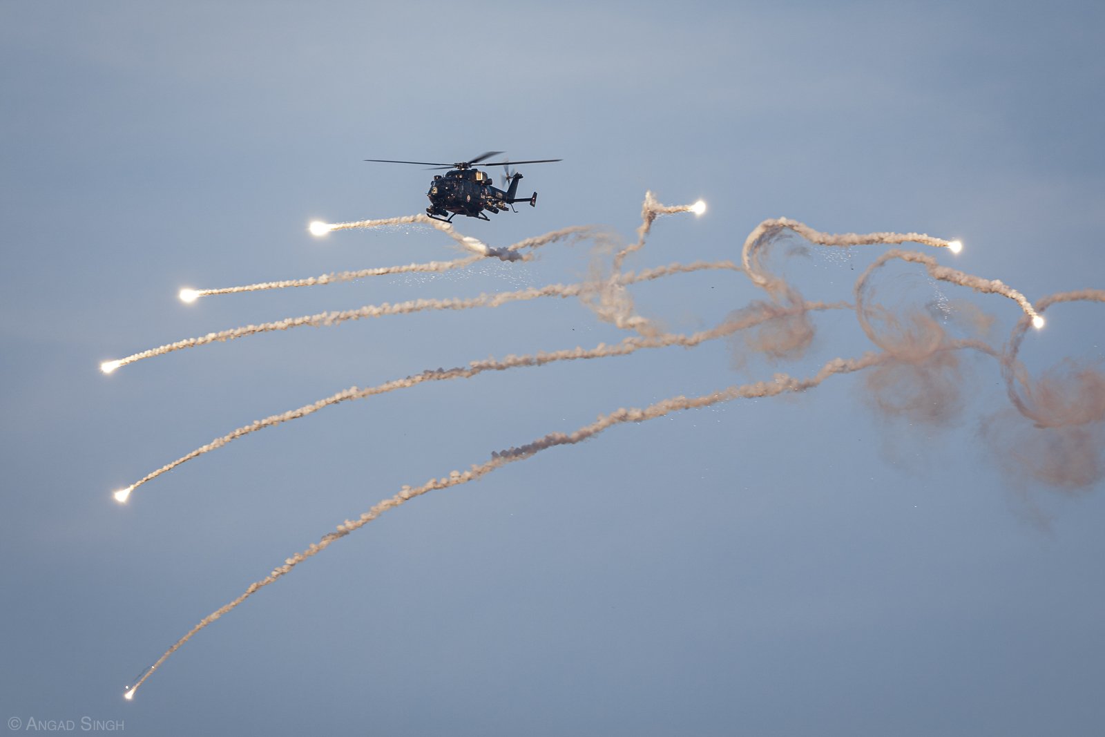 The sunset phase was dominated by helicopter and special operations, first with a pair of Apaches coming in at ultra-low level along the desert floor before popping up and firing a Hellfire each at simulated tank targets. These were followed by HAL Advanced Light Helicopter (ALH) Mk IVs strafing a forward rearming/refueling point with their 20mm chin guns.