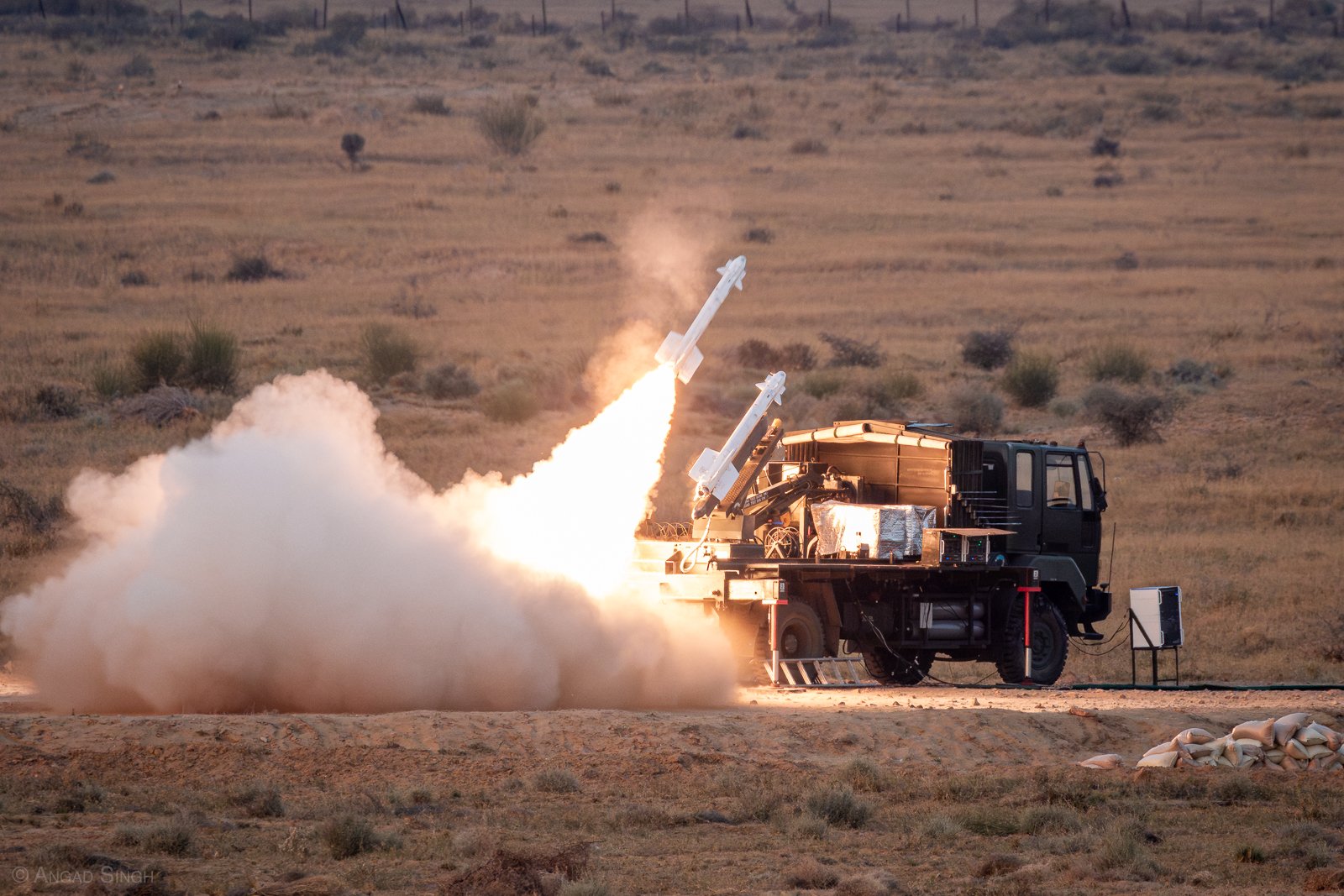 The final daylight strike was an air defense suppression demo by a loitering munition, an Israeli Harop drone, that dove in and destroyed a simulated radar site. As the sun set over the range, the SAMAR surface-to-air missile system swung into action, targeting a drone with its ground-launched R-73.
