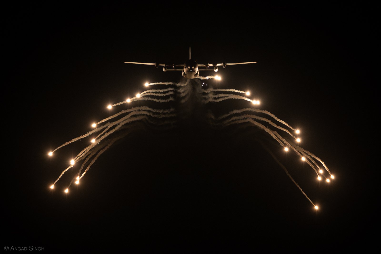 After a short break, the night phase of the exercise began with a heliborne special forces building intervention — one Mi-17 lit up a building with its searchlight as a second delivered its load of commandos, who first fast-roped onto the roof before rappelling down and through the windows to clear out enemy combatants. As the helicopters exited the area, a single C-130J appeared from the darkness and carried out a spectacular dump of all its flares.