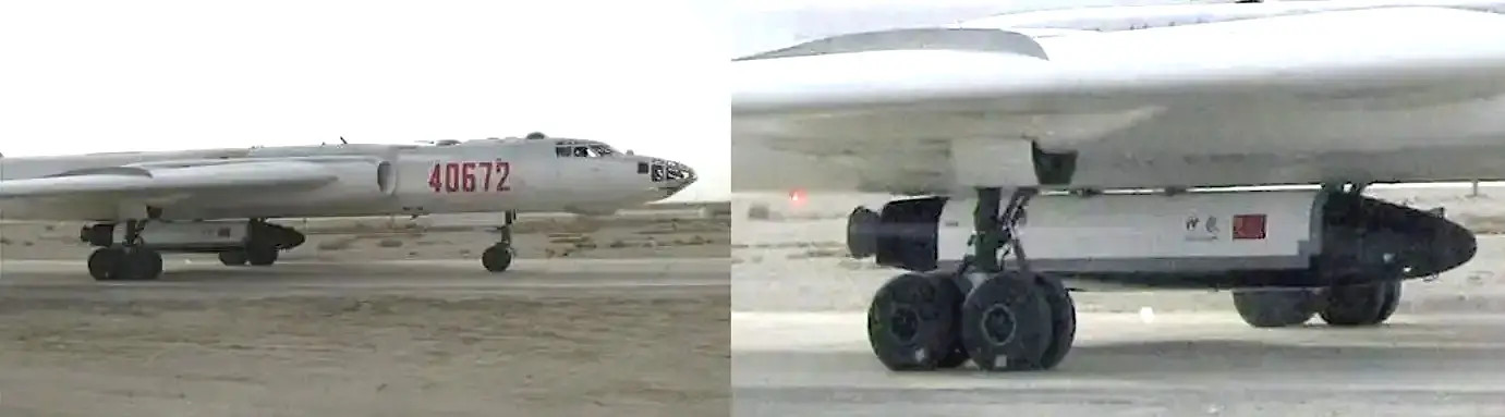 There are some similarities in the general shape and configuration of the MD-22 mockup and what is seen underneath the H-6 in the picture that has recently emerged. It also looks to be roughly one-third as long as the H-6 carrying it, which would also be in line with the previously stated expected length of a real MD-22 (just under 35.5 feet or 10.8 meters). The baseline version of the H-6 has a length of just over 114 feet (34.8 meters), with newer versions being only slightly longer.