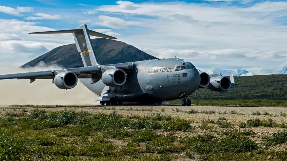 The C-17 can transport 100,000 pounds of cargo more than 4,500 nautical miles. It can make high-angle, steep approaches at relatively slow speeds, allowing it to operate into small, austere airfields and onto runways as short as 3,500 feet long and just 90 feet wide. While it has tactical capabilities, it’s equally adept as a long-range, heavy-lift strategic transport.