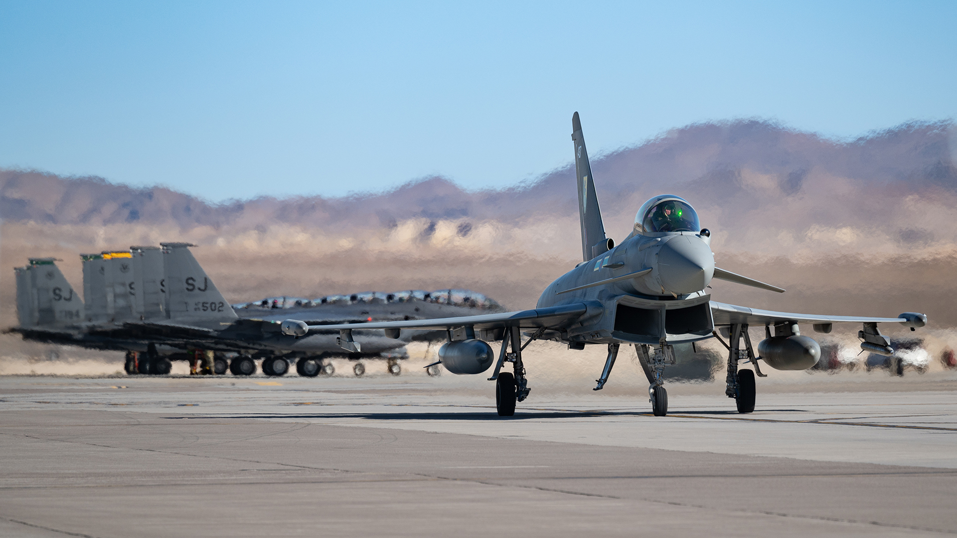 A Royal Air Force Typhoon FGR4 and USAF F-15Es at Red Flag 24-1, which focused on warfighting in the Indo-Pacific theater. USAF/William R. Lewis