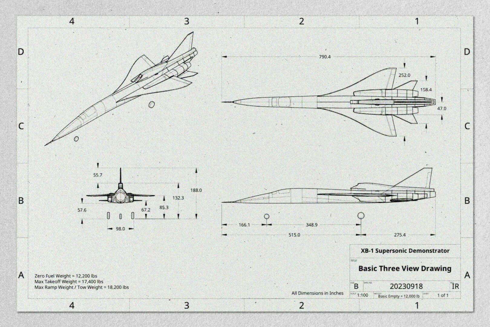 XB-1, which The War Zone has previously written about, measures 62.6 feet long and features an elongated delta-wing planform with a wingspan of 21 feet. The demonstrator “leverages state-of-the-art technologies” in order “to enable efficient supersonic flight including carbon fiber composites, advanced avionics, digitally-optimized aerodynamics, and an advanced supersonic propulsion system,” Boom highlights.