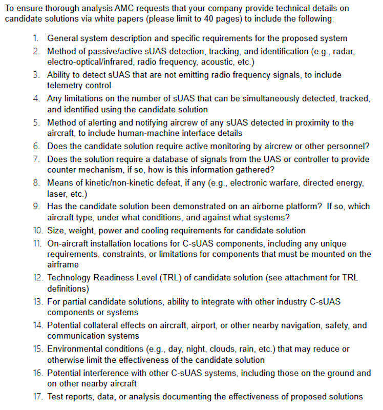 Firstly, “AMC is interested in information on concepts and technologies that… represent full or partial on-aircraft C-sUAS [counter-small uncrewed aerial systems] capability solutions,” according to the Request For Information (RFI) notice. “Partial capability solutions could include those that only satisfy a sub-set of the desired C-sUAS functions (e.g., only detect, track, and identify sUAS; no defeat); or are otherwise limited (e.g., operable only in-flight or during certain environmental conditions).”