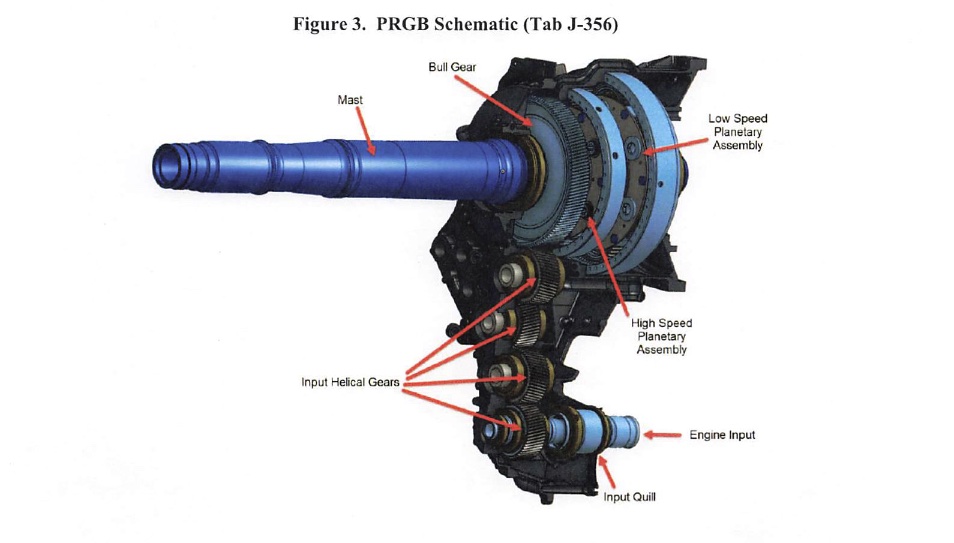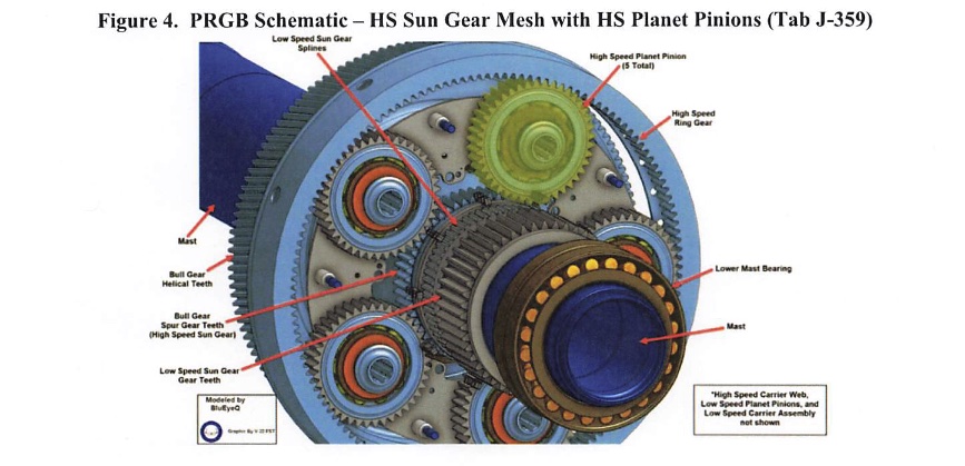 After an analysis of the parts of the left-hand PRGB that could be recovered, it was determined that the catastrophic failure in this instance was “most likely initiated by a crack in one of the high-speed pinion gears and fatigue cracking of the associated pinion gear’s bearing cage. Additionally, at least one piece of the failed high-speed planet pinion wedged in the high-speed carrier assembly, grinding against the high-speed sun gear’s teeth until finally removed.”