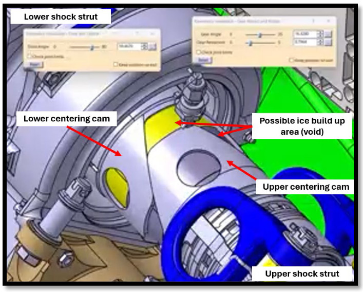 “The NLG centering cams are used to ensure proper centering of the NLG. One of the cams is mounted at the top of the landing gear strut and the other one is mounted at the bottom of the landing gear,” the report adds. “At the beginning of the mishap flight, the NLG didn’t fully extend due to ice build-up within the NLG strut. This ice buildup was the combination of significant water contamination in hydraulic fluid used to service the struts and ambient freezing temperatures around Eielson AFB (Tab J-189). The lack of full extension caused a misalignment that prevented the NLG uplock hook from catching the NLG uplock roller, causing damage to the metal adjacent to the roller.”