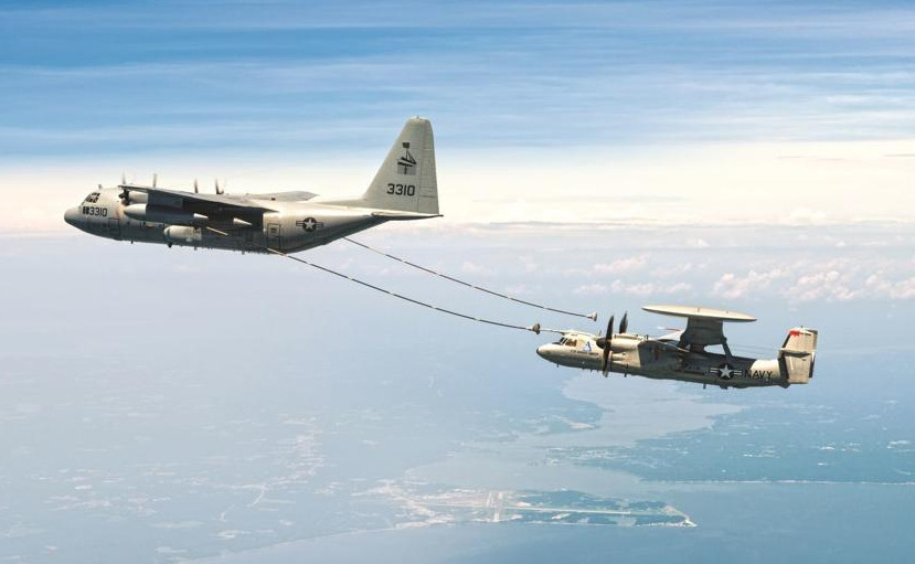 The video from CENTCOM showing an Air Force HC-130 refueling the E-2D highlights how that service can keep the Navy aircraft in the air, even without using larger jet-powered tankers. MC-130 special operations Hercules aircraft could also provide this sustenance to the E-2D, along with U.S. Marine Corps KC-130J tanker-transports. USAF jet powered tankers can refuel the E-2D as well using hose and drogue systems internal to the aircraft, such as on the KC-10 and KC-46, or via a boom adapter (‘Iron Maiden’) found on the KC-135. It isn’t clear if the E-2D is cleared to refuel from the KC-135R’s wingtip refueling pods, but we doubt it is.