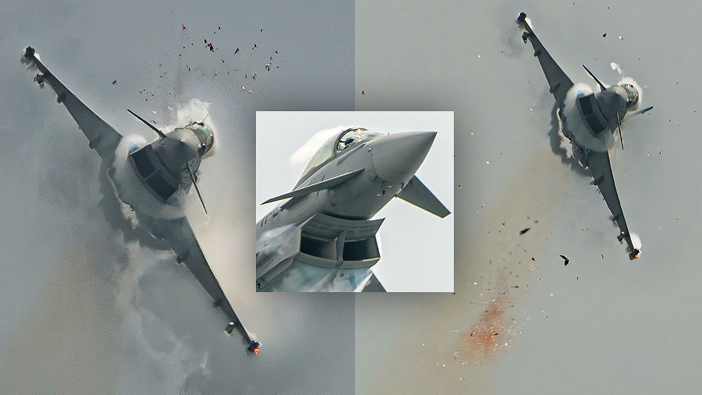 The second shot shows the immediate aftermath of the gull impacting the right side of the Eurofighter’s canopy and shattering into a shower of feathers and bone.