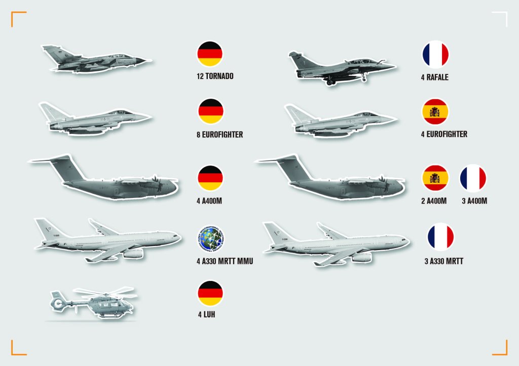 Providing aerial refueling support will be four A330 Multi-Role Tanker Transports (MRTT) from the Germany-based portion of the Multinational MRTT Unit (MMU) in Cologne and three more A330 MRTTs from France.