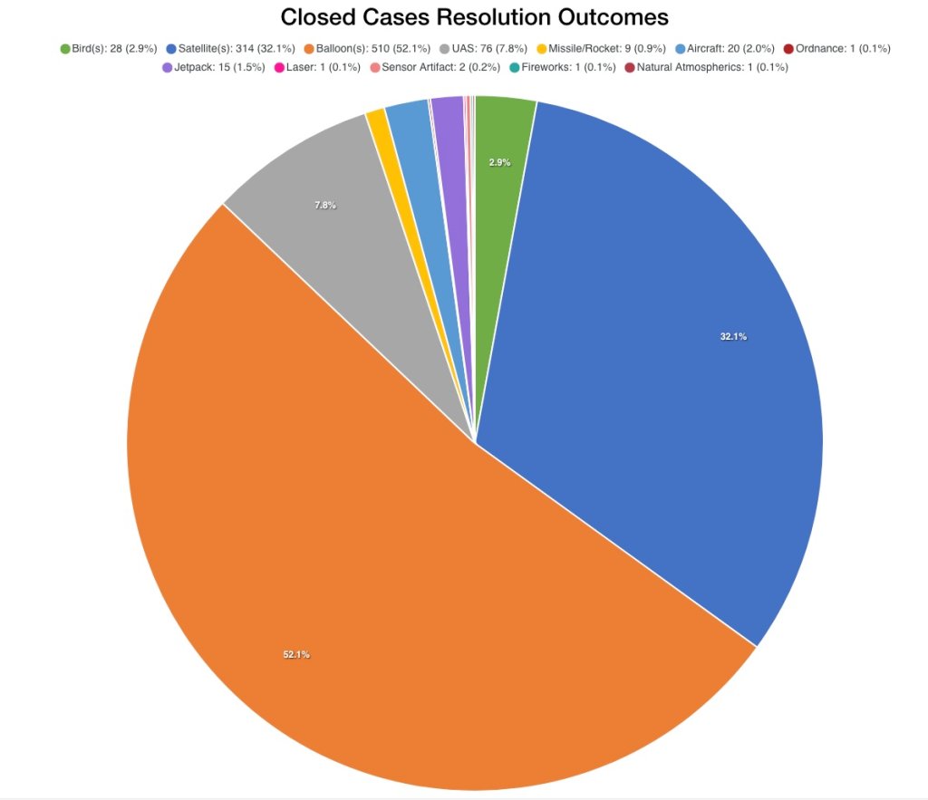 According to the most recent AARO data from a 30-year period up to January 15, 2026, balloons were named as the source of 52.1% of all UAP reports where an identification could ultimately be made. Satellites were the next most commonly identified objects. Sightings of SpaceX Starlink constellations in particular have often been reported as UAP. This is especially true for pilots seeing ‘flares’ from the Starlink satellites, which can look like aircraft making circles on the horizon.