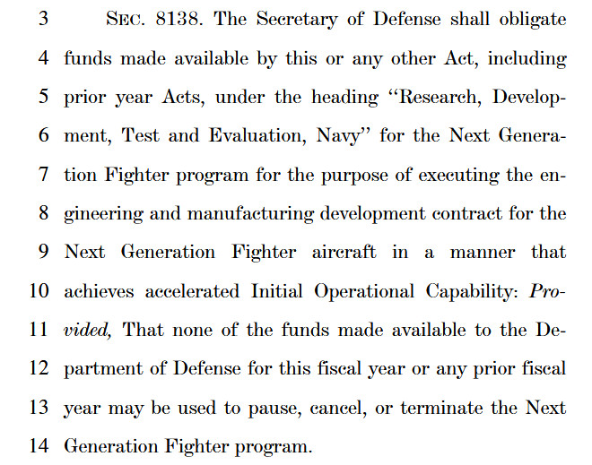 In addition, the text of the draft legislation includes an explicit provision that compels the Secretary of Defense to obligate funding “for the purpose of executing the engineering and manufacturing development contract for the Next Generation Fighter aircraft in a manner that achieves accelerated Initial Operational Capability.” It blocks the use of any funding appropriated for F/A-XX to “pause, cancel, or terminate” the program, as well.