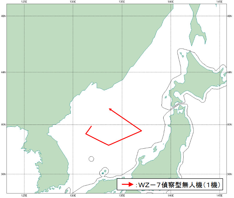 The WZ-7 “came from the continent [of Asia], circled over the Sea of Japan, and then headed northwest toward the continent,” according to a machine translation of the Japanese-language release. This aligns with the map, seen below, that Japanese authorities included in their release showing the drone’s flight path. We will come back to this later.