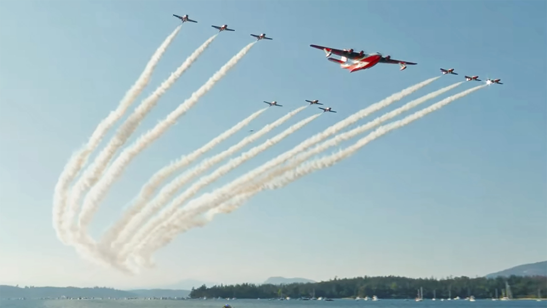Thousands of spectators gathered on Vancouver Island yesterday to watch Hawaii Mars complete its flight from Sproat Lake in Port Alberni to its new home at the B.C. Aviation Museum in Sidney on Vancouver Island. For part of its roughly two-hour flight, which took it over various local communities, the flying boat was accompanied by the nine CT-114 Tutor jet trainers of the Canadian Forces Snowbirds demonstration squadron. Among others, the behemoth made fly-bys of Port Alberni, Comox, Campbell River, Powell River Nanaimo, the Gulf Islands, and downtown Victoria.