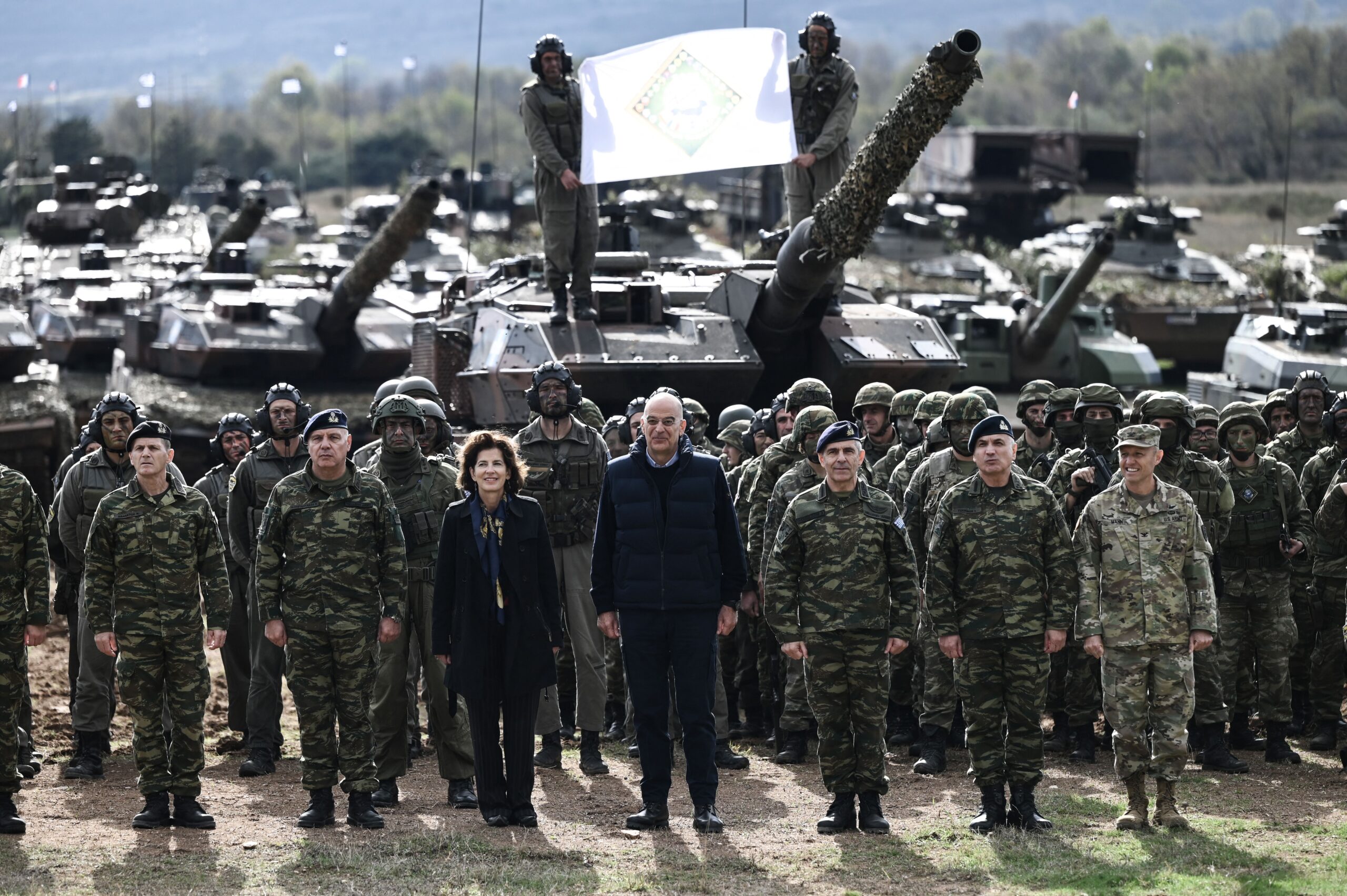 Greek Minister of Defense Nikos Dendias (center, right) and French Ambassador to Greece Laurence Auer (center, left) pose with soldiers during the Olympic Cooperation 23 exercise at the Petrochori training area, near Xanthi, northern Greece, on November 24, 2023. Photo by SAKIS MITROLIDIS/AFP via Getty Images