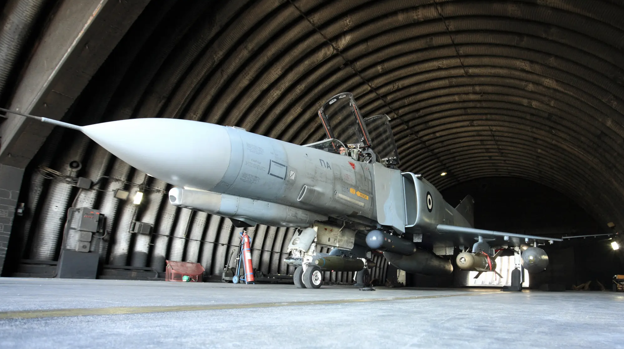 A Hellenic Air Force F-4E in its hardened aircraft shelter, armed with the Vietnam War-era HOBOS TV-guided bomb. Hellenic Air Force