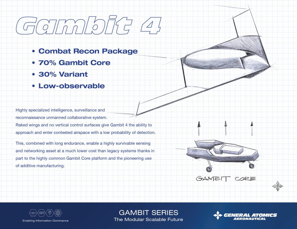General Atomics has presented a variety of very different potential Gambit drones, but they are all designed around a common ‘chassis’ that includes landing gear, as well as key mission and flight control computer systems. To date, Gambit 4 has been consistently depicted as a stealthy flying wing-type design intended for long-endurance persistent ISR missions that is fully in line with the MQ-Next concept General Atomics had previously shown, as seen in the video below.